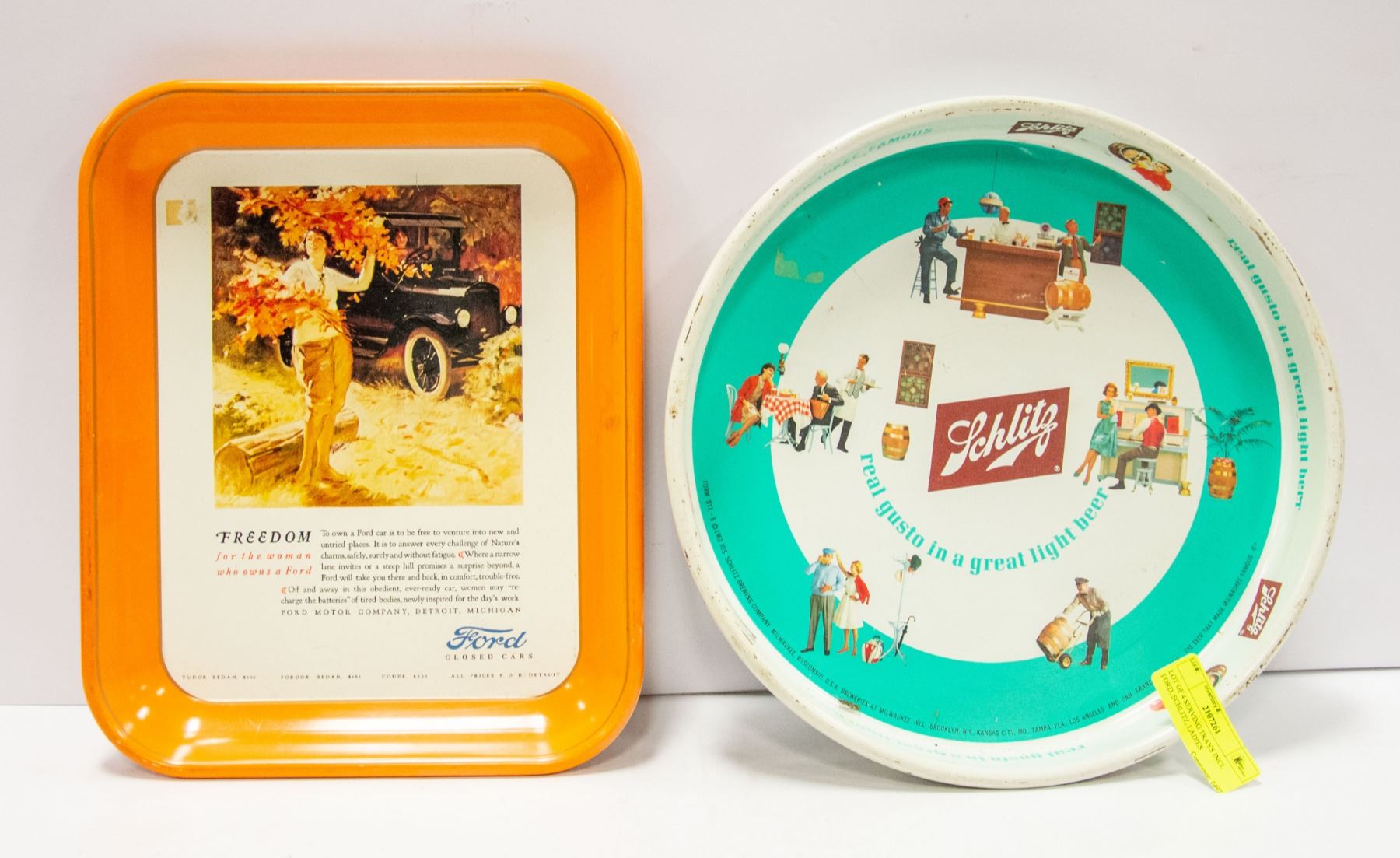 LOT OF 4 SERVING TRAYS INCL FORD, SCHLITZ, LADIES