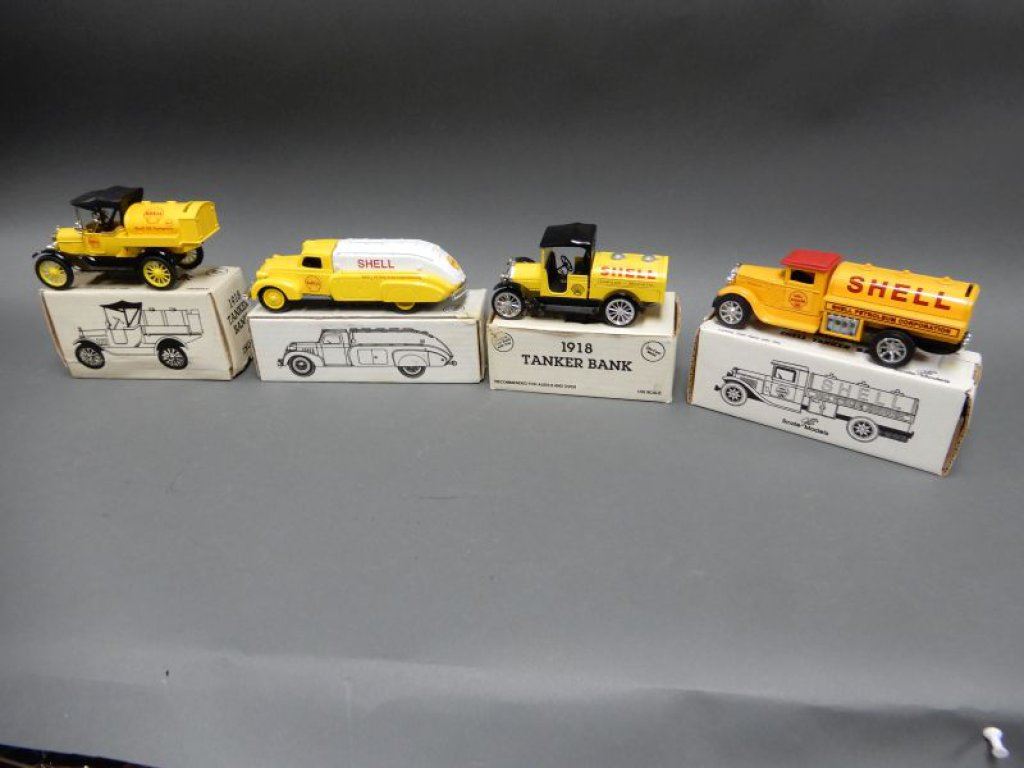 LOT OF 4 SHELL ERTL BANKS/BOXES ONE IS MISSING COVER & KEY LOCATION: LOWER LEFT