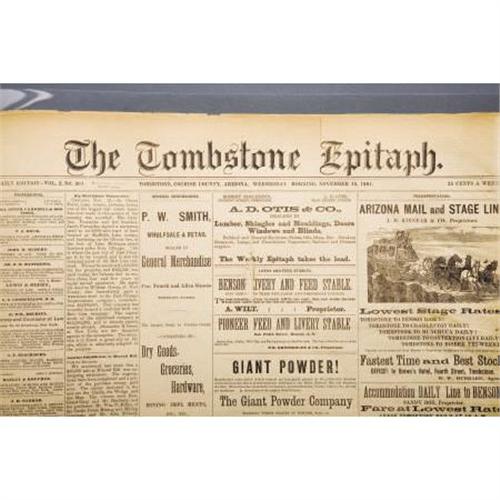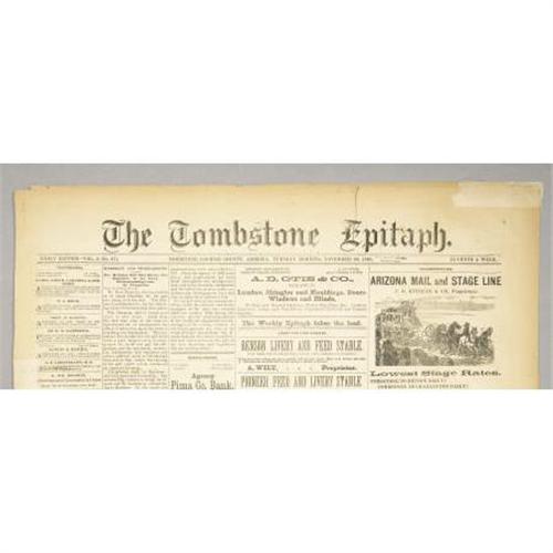 <B>LOT OF (4) “THE TOMBSTONE EPITAPH” ARIZONA NEWSPAPERS 1881</B></I> - <BR><BR>Tombstone, Cochise County Arizona. This lot consists of 4 different newspapers pertaining to the Famous Tombstone Arizona Territory. They all have Vignettes of Stagecoaches & Shotguns. News of the day, ads, Etc. Poor-good condition.<BR><BR><b>Shipping:</b> Flat Material, Large (<a target="_blank" href="http://www.heritageauctions.com/common/shipping.php">view shipping information</a>)