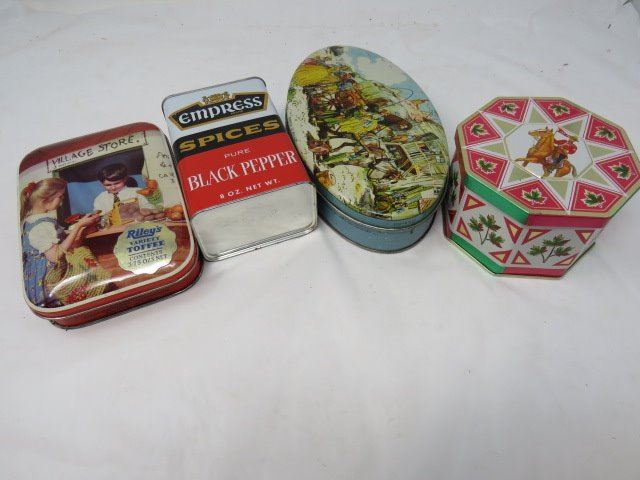 LOT OF 4 TINS (RILEYS TOFFEE, EMPRESS SPICES, 2 TINS)
