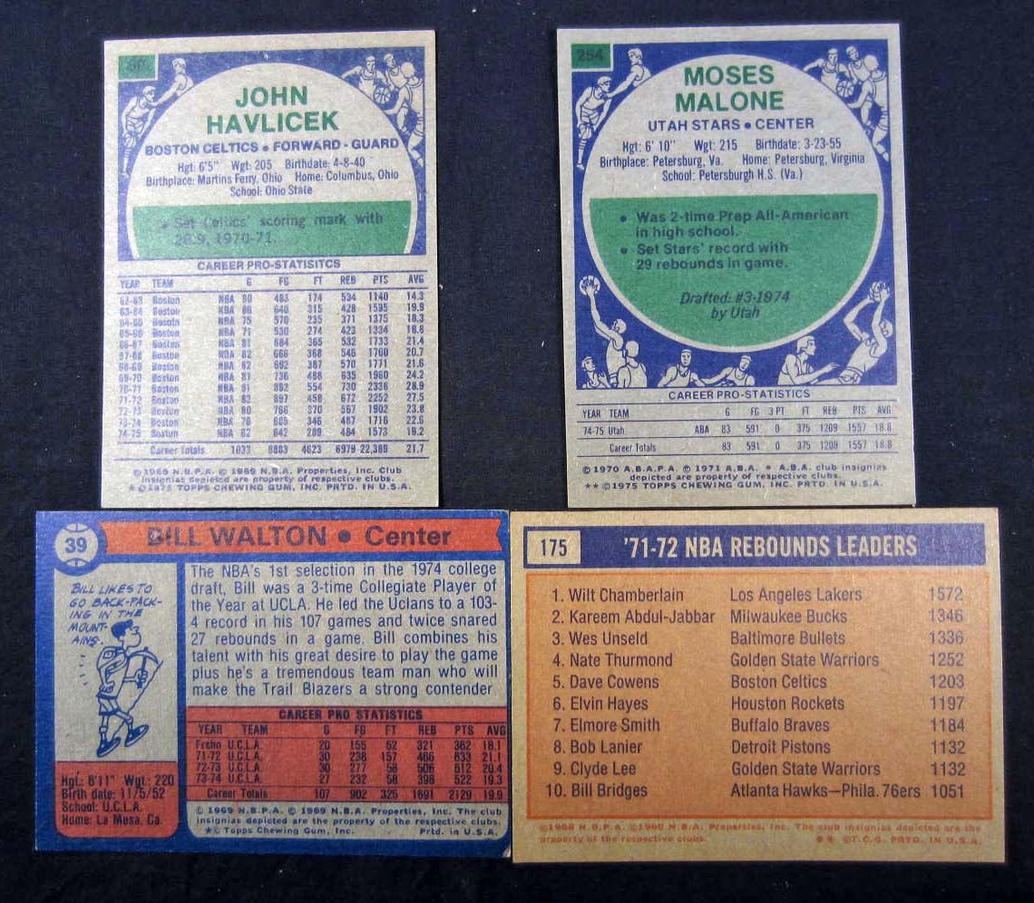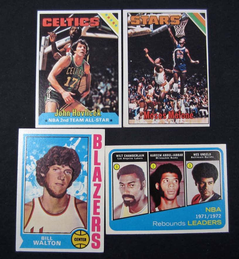 1972-73 Wilt Chamberlain/Kareem Abdul-Jabbar card #175, 1974-75 Bill Walton Rookie card #39, 1975-76 Moses Malone Rookie card #254, 1975-76 John Havlicek card #80. All in EX - EX-MT and are ready for grading.