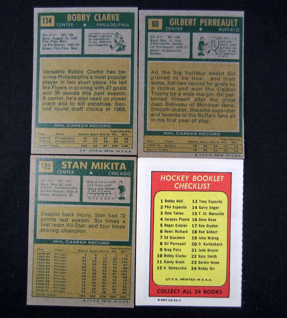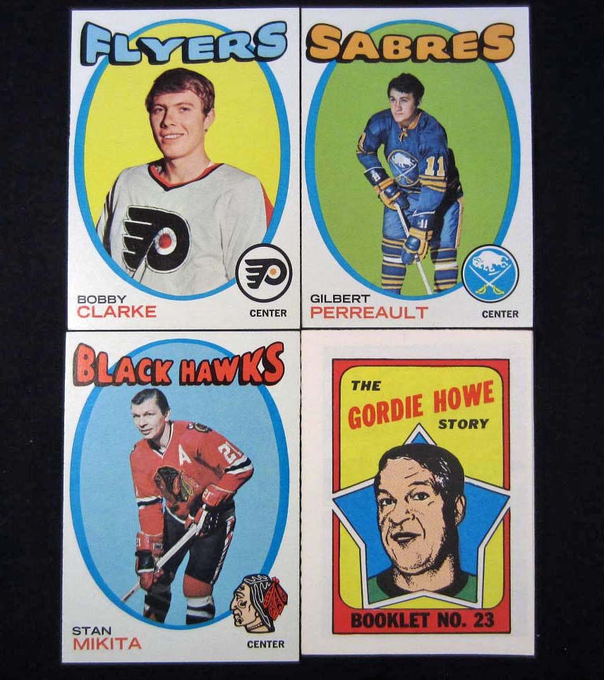 1970-71 Gilbert Perreault Rookie Card #60, 1970-71 Bobby Clarke card #114, 1970-71 Stan Mikita card #125, 1971-72 Gordie Howe Storybook card #23. All in EX+ to NM and ready for grading.