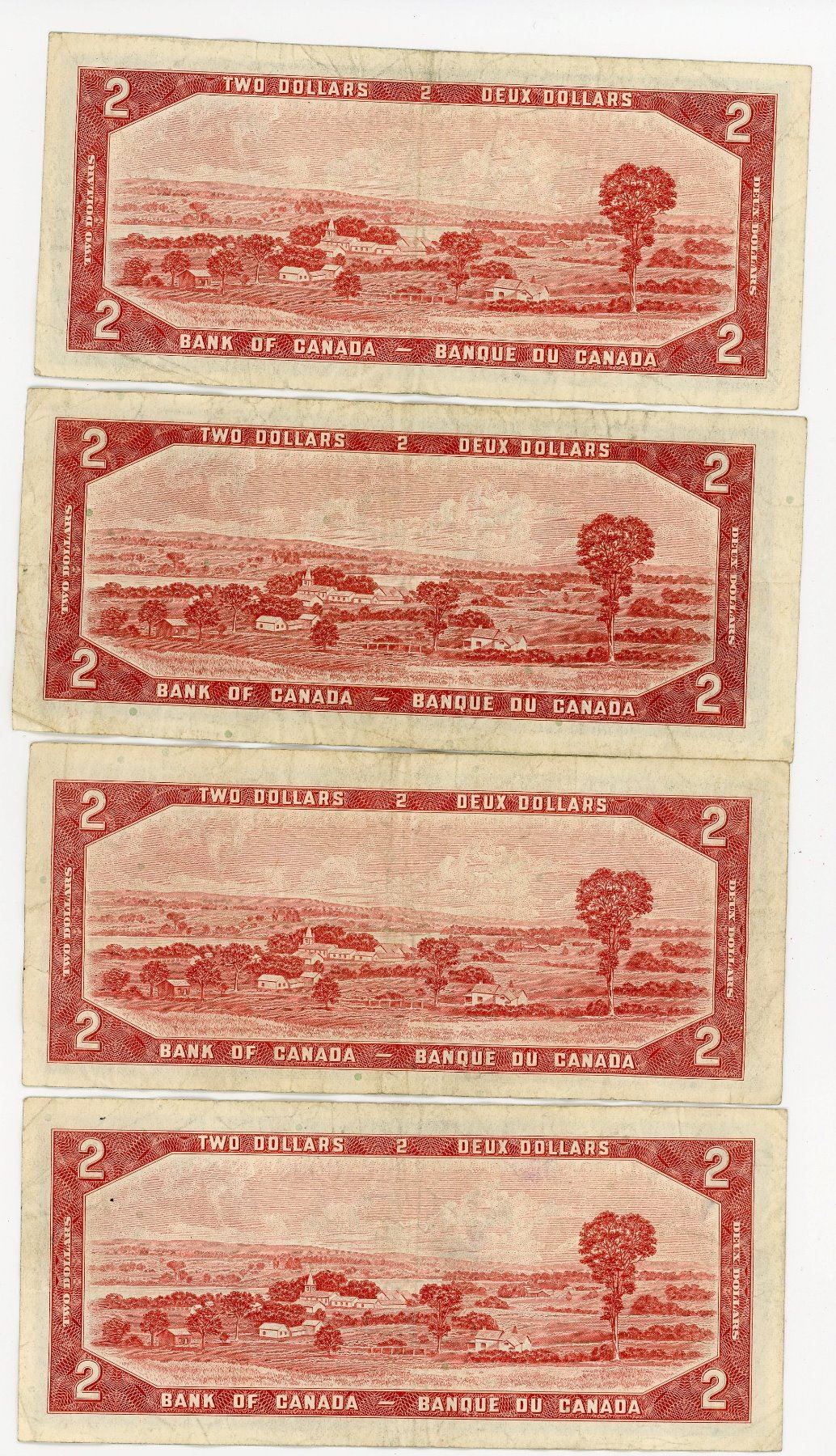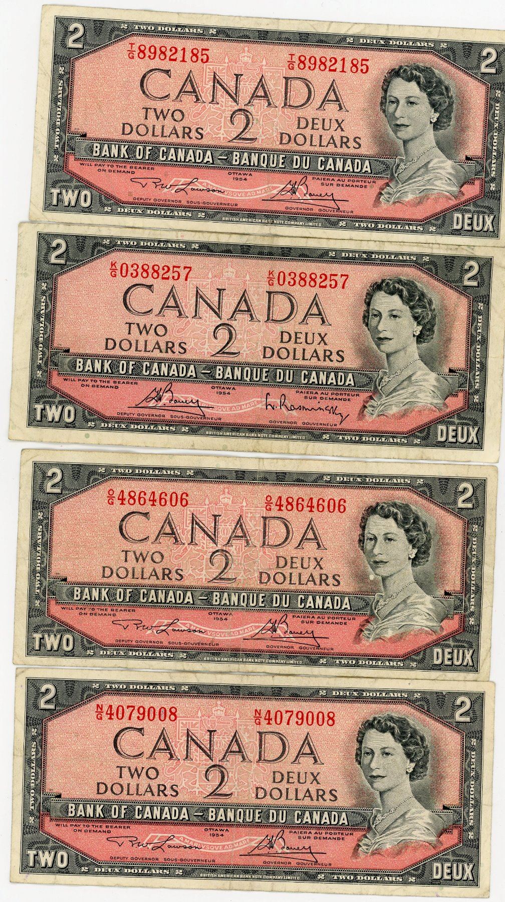 LOT OF 4-TWO DOLLAR BILLS (CANADA) *1954*