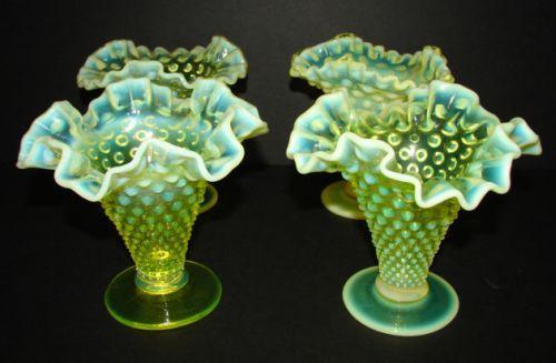 LOT OF 4 OPALESCENT VASELINE GLASS VASES. Hobnailed pattern. Fluted tops. All vases differ slightly in shape at top. No mark. 5” H