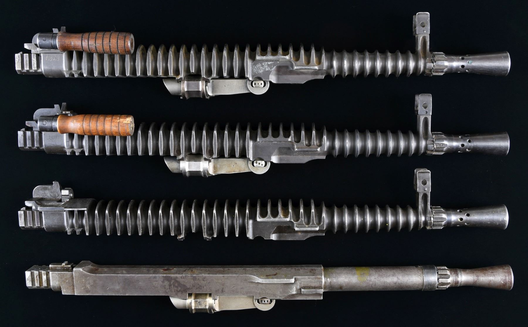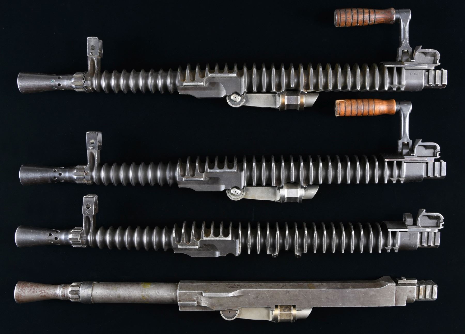 This lot consists of four 8mm Mauser ZB-37 bbls. Bbl. assemblies all have their flash hiders. One bbl. has carry handle and three have their front sights. CONDITION: one bbl. is an overall gray color, others retain a high degree of arsenal blue with scattered fading, edge wear & moderate oxidation. Bores all have evident rifling with dried grease & some oxidation. PROVENANCE: From the Estate of Ivan Lee Shapiro. (02-23507/MJC). $400-600 for lot.