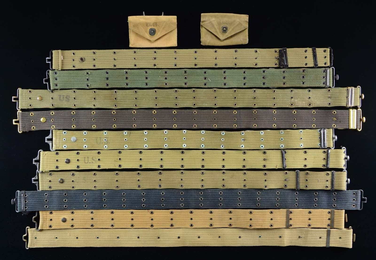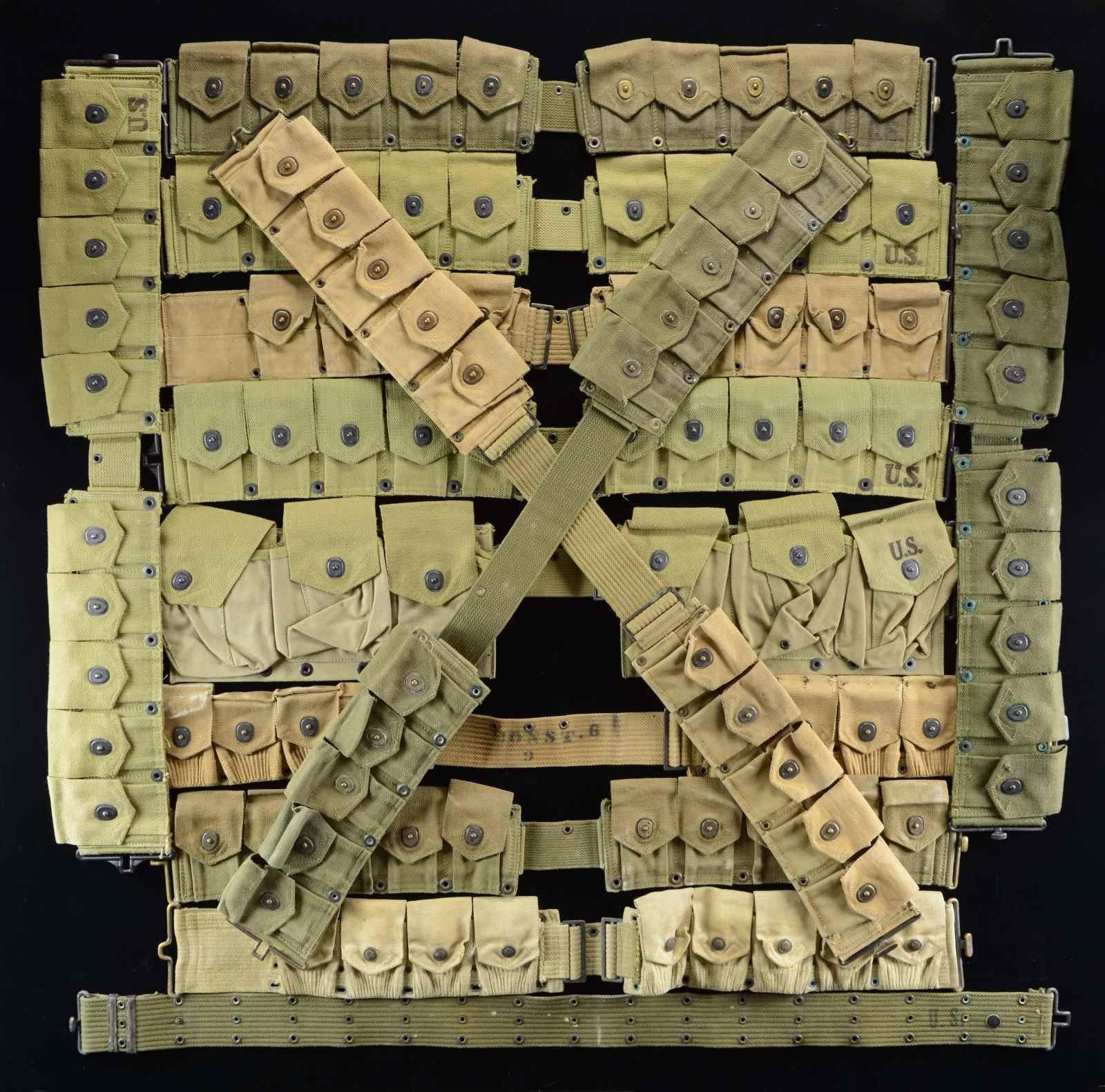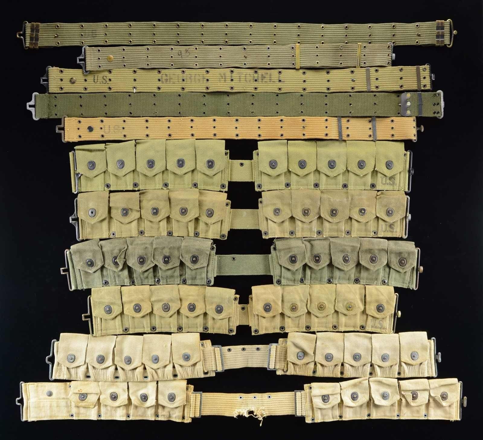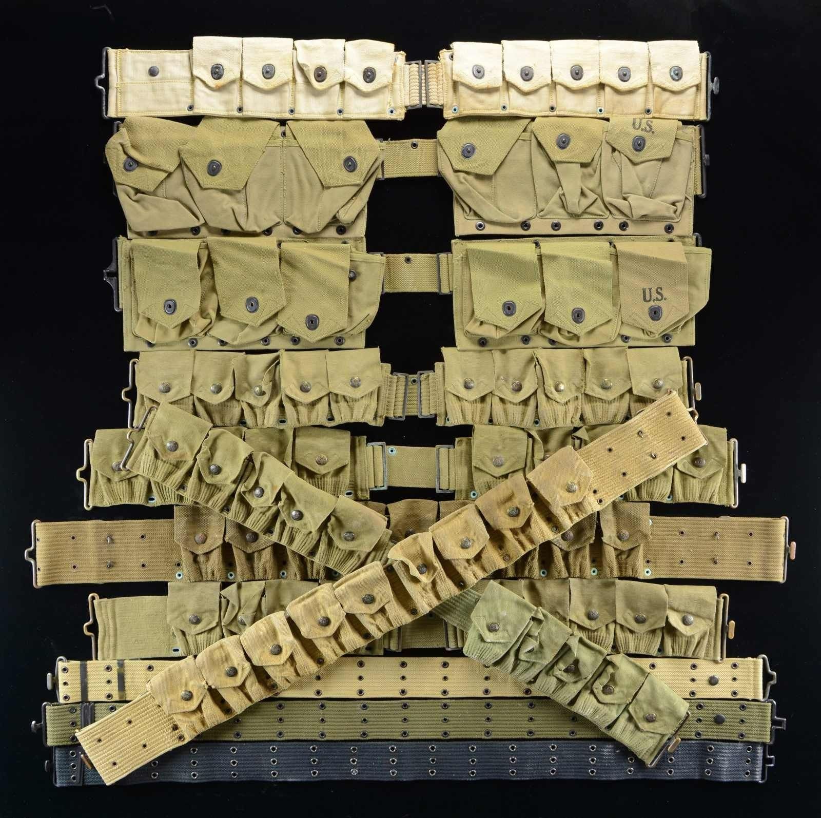 This lot consists of about 45 assorted USGI pistol belts & various cartridge belts. Notable among them are three BAR mag belts, seven M1903 cartridge belts mostly made by Mills, three US M1910 cartridge belts, 13 various M1923 belts including some post WW2 variants & a couple marked USMC. Also present are a US First aid pouch & another small unmarked USGI style pouch. The balance of the other items in the lot are USGI pistol belts w/ a mix of different models. CONDITION: belts show varying degrees of staining, age related wear & some showing fraying. (02-22452/MJC). $1000-1500.