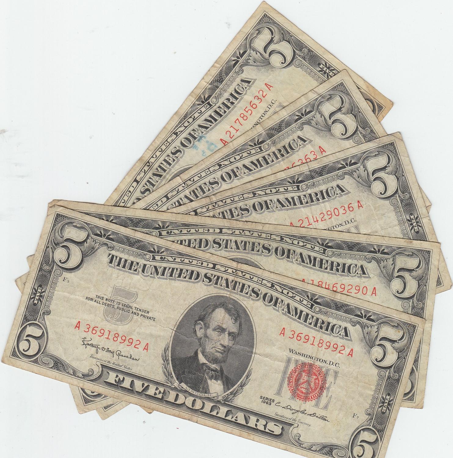 LOT OF 5 $5 1963 RED SEAL NOTES $25 FACE