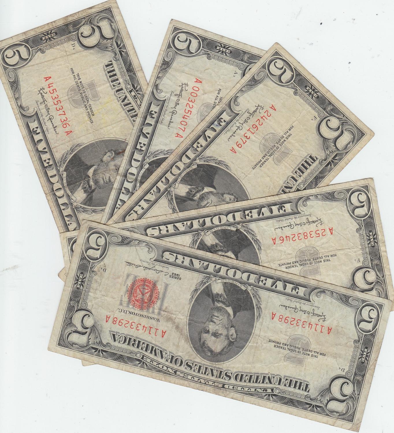 LOT OF 5 $5 RED SEALS 1963