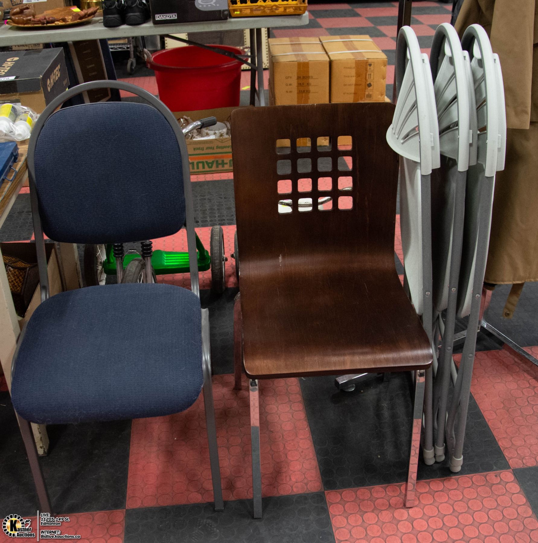 LOT OF 5 ASSORTED CHAIRS, 3 FOLDING CHAIRS ARE NEW