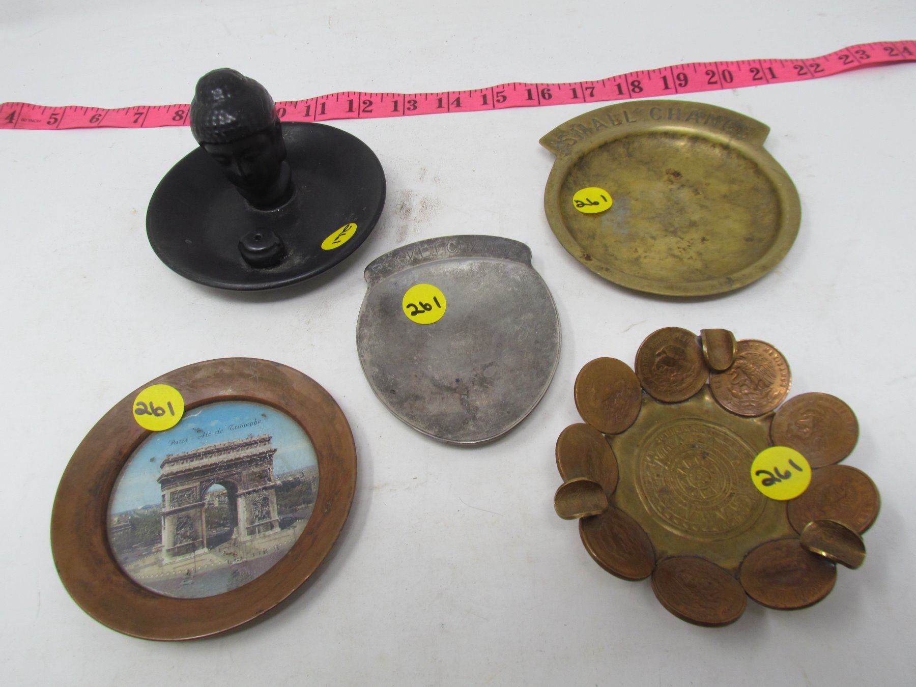 LOT OF 5 ASSORTED CHANGE TRAYS AND ASHTRAY (BRASS, COPPER)