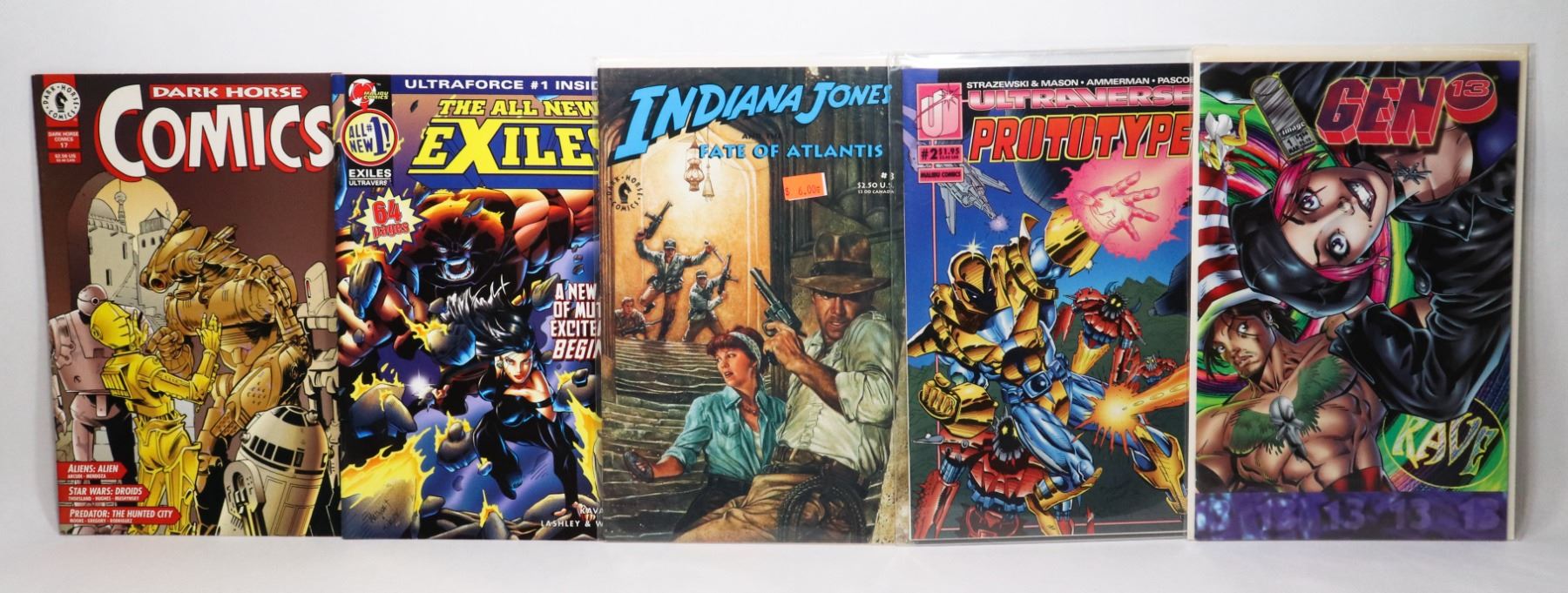 THE ALL NEW EXILES #1 DARK HORSE COMICS #17 INDIANA JONES AND THE FATE OF ATLANTIS #3 ULTRAVERSE PROTOTYPE #2 GEN 13 #1***ITEM(S) LOCATED IN LETHBRIDGE ALBERTA. ALL ITEMS IN THIS AUCTION ARE ELIGIBLE FOR OUR FREE TRANSPORT TO EDMONTON OFFICE SERVICE. WORLDWIDE CANADA POST SHIPPING IS AVAILABLE