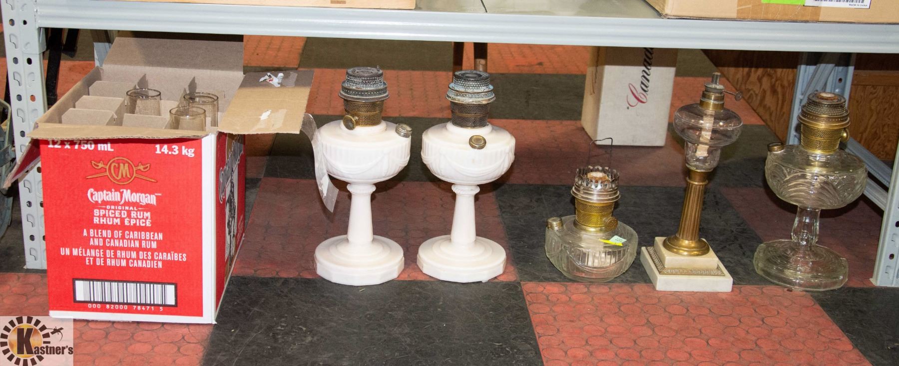 LOT OF 5 ASSORTED OIL LAMPS WITH 3 TOPPERS