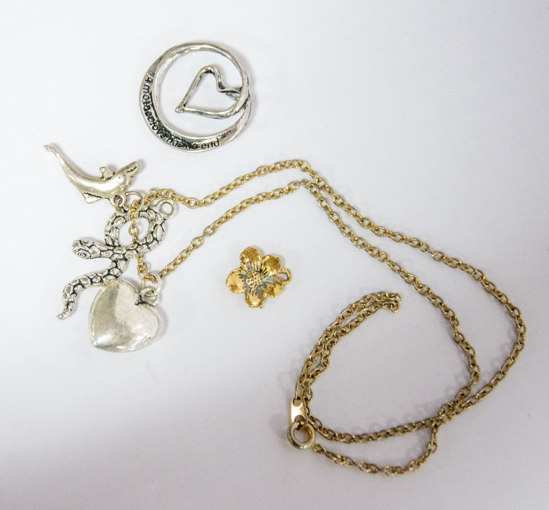 TOTAL WEIGHT 15.21 GRAMS - SILVER HEART PENDANT, SILVER SNAKE PENDANT, SILVER DOLPHIN PENDANT, SILVER "MOM" PENDANT, GOLD FLOWER PENDANT + ONE CHAIN/NECKLACE