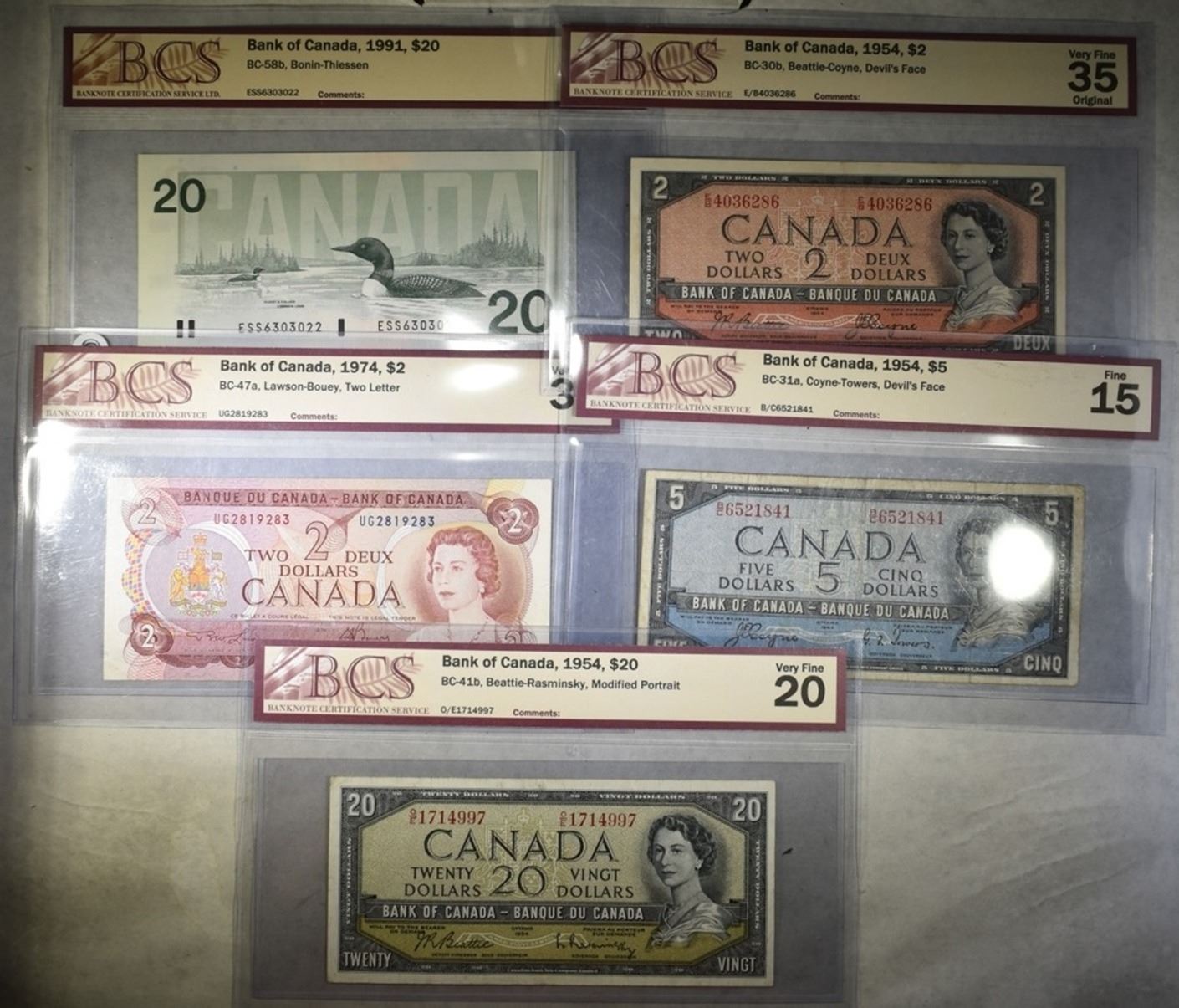 1954 $5 VF, 1954 $5 FINE, 1954 $20 VF, 1974 $2 VF & 1991 $20 CHOICE UNC ORIGINAL. ESTIMATE $150 - $175.