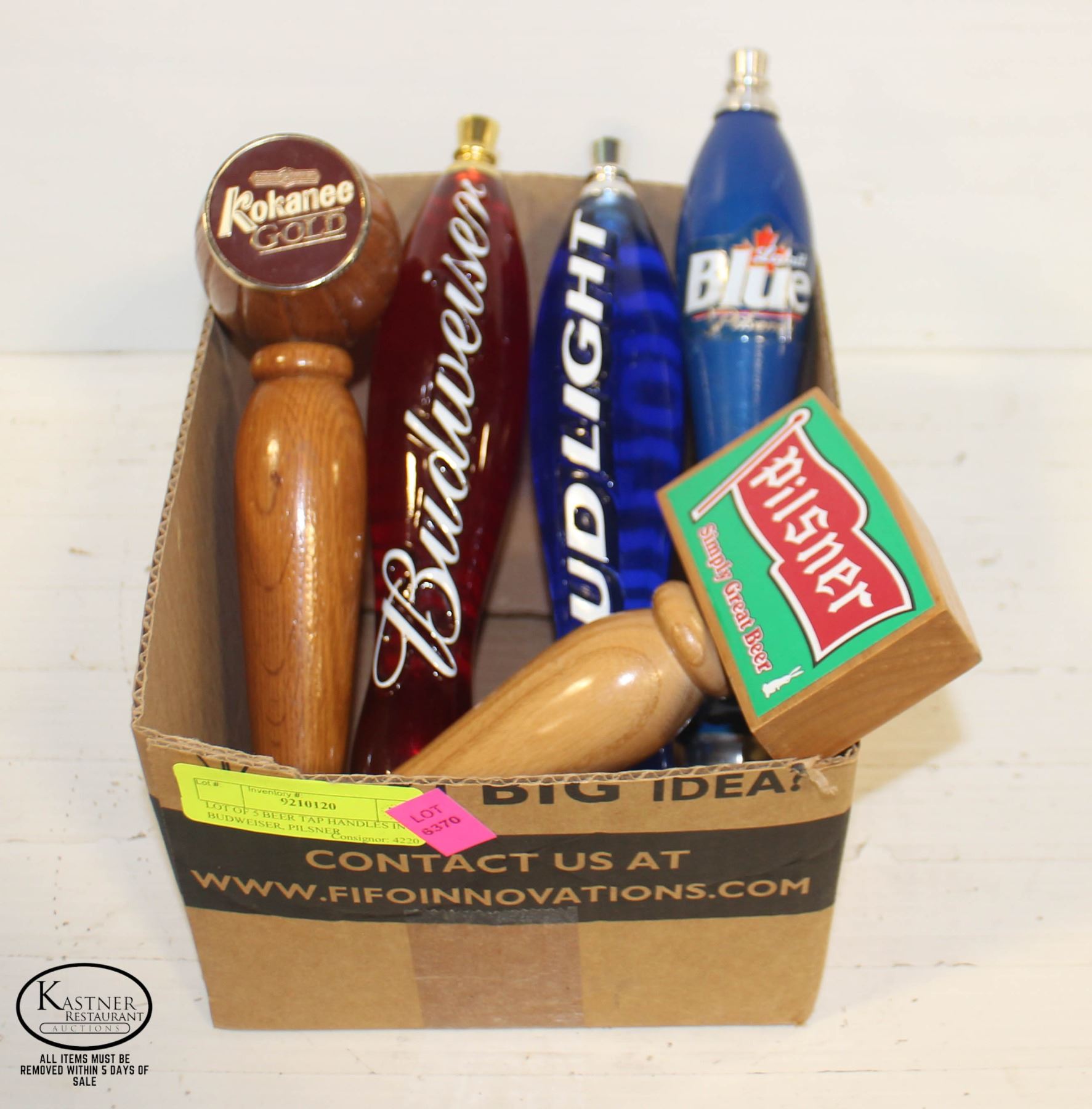 LOT OF 5 BEER TAP HANDLES INCL: BUDWEISER, PILSNER