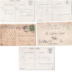 LOT OF 5 FAN DECORATED BIRTHDAY POSTCARDS. One is published by A. & S. and is postmarked illegibly on reverse. One has no publisher mark and is postmarked 1907 on reverse. Three are marked "Printed in Germany" on reverse with no postmark.