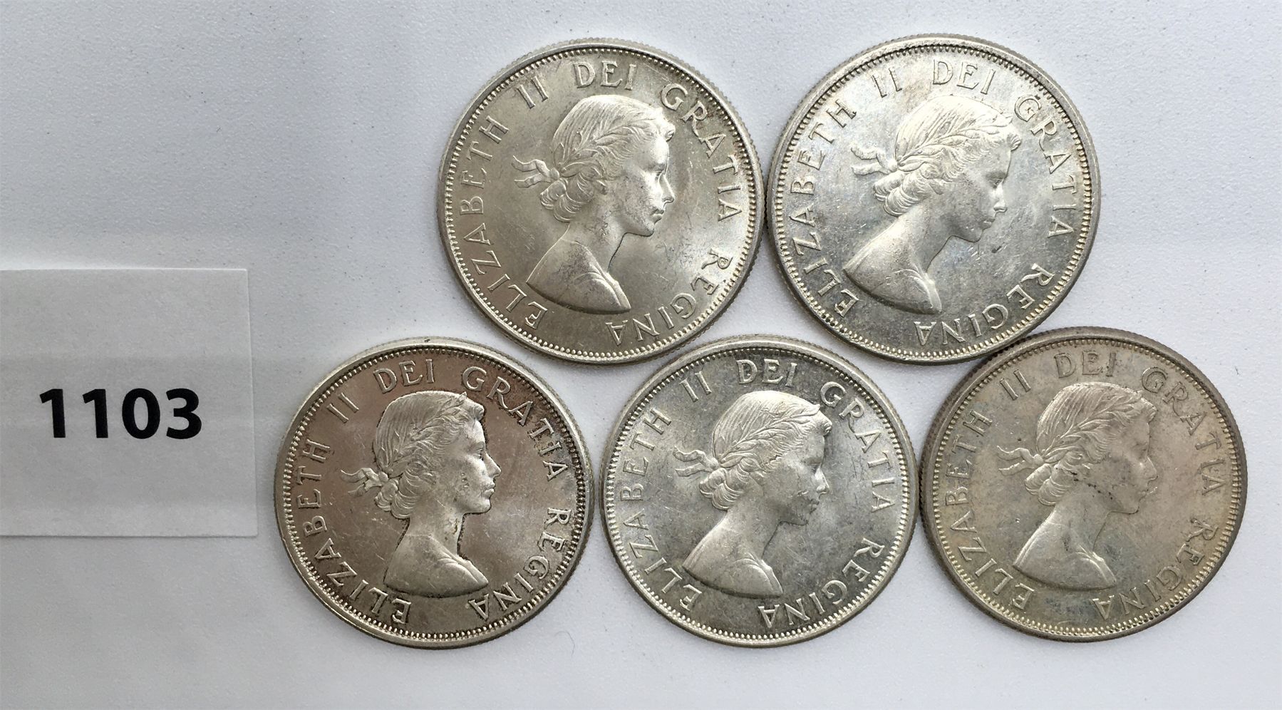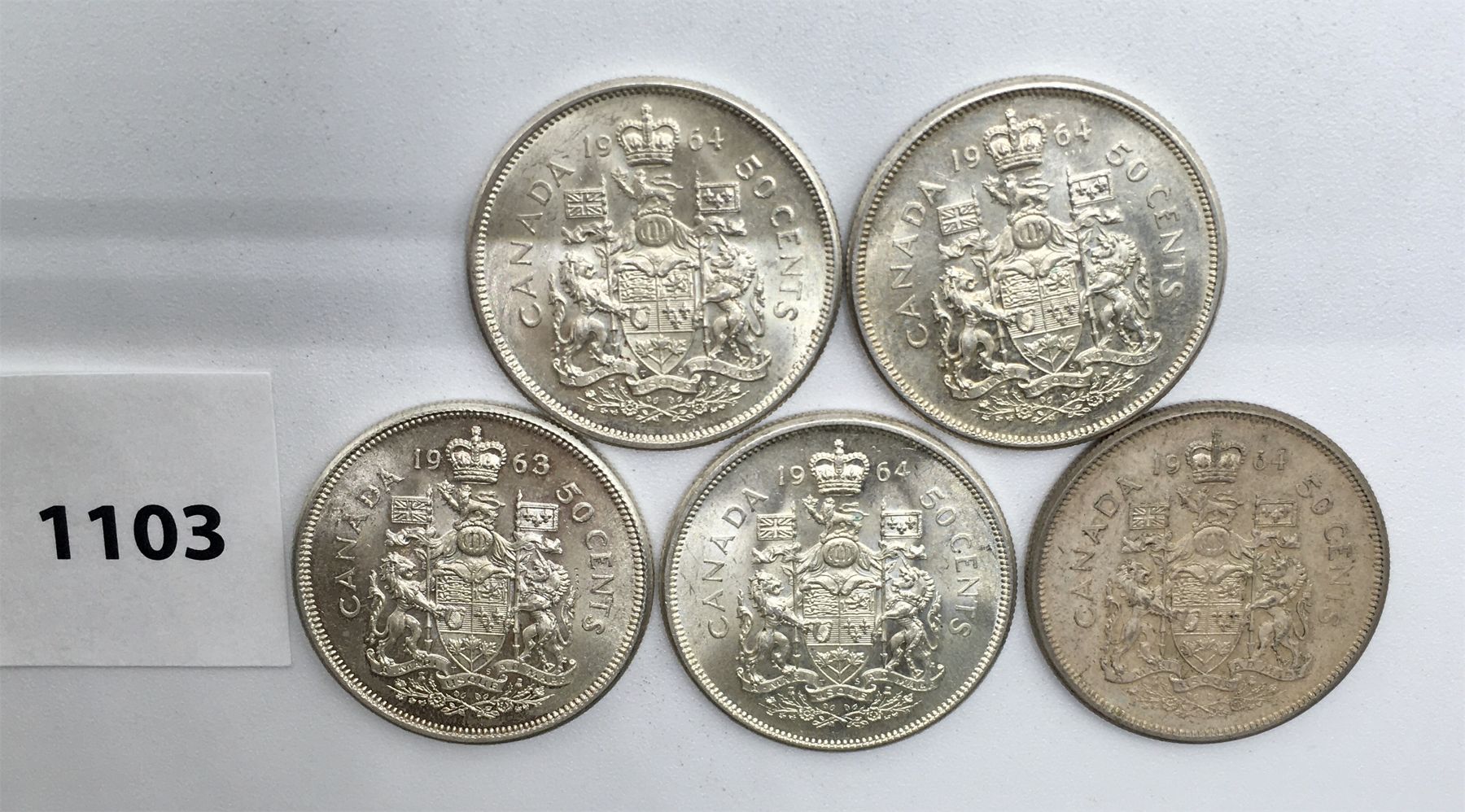 LOT OF 5 - CDN FIFTY CENT PIECES - 1963, 4X 1964