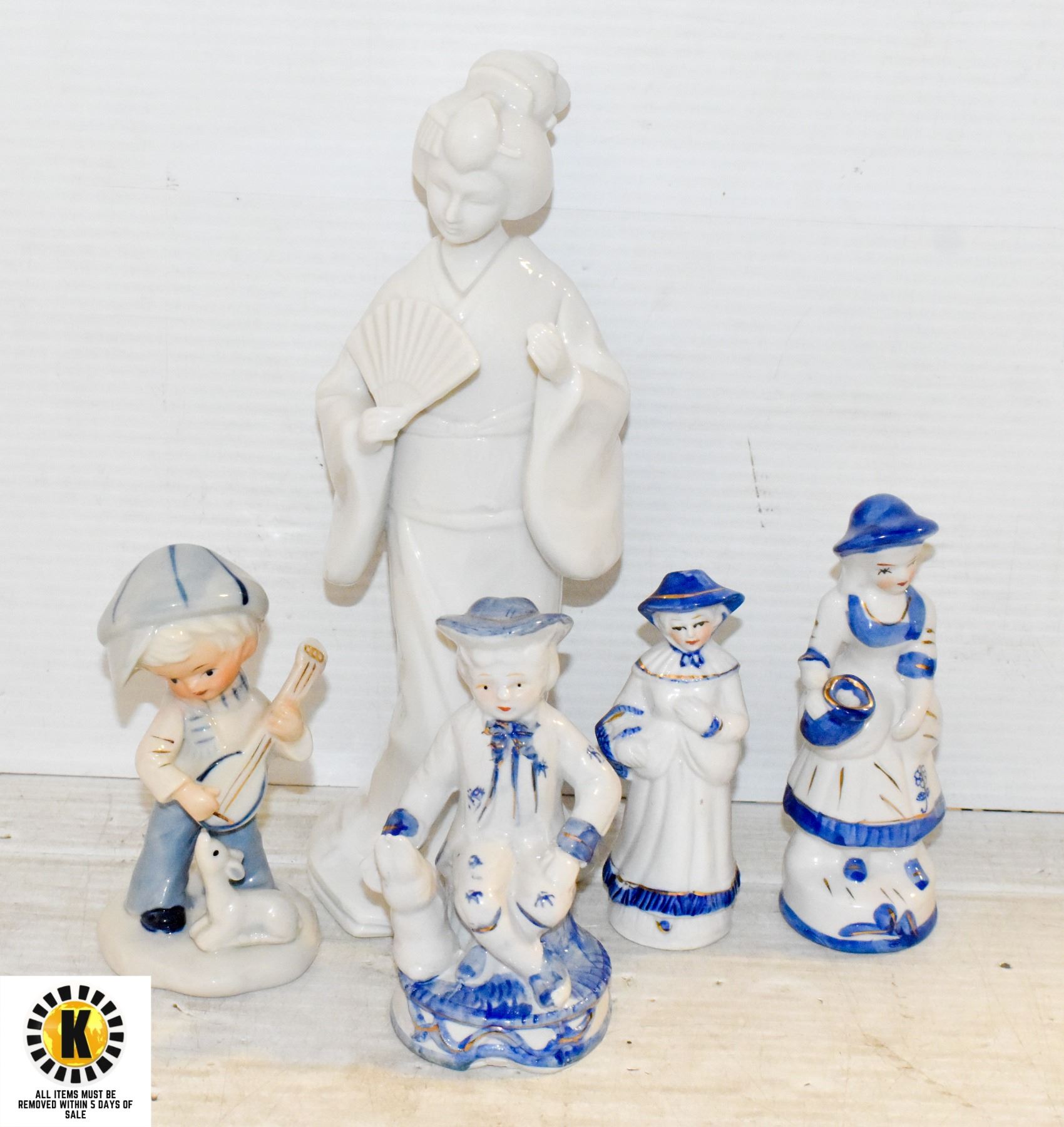 LLADRO STYLE WHITE GEISHA AND 3 DELFT FIGURINES & CHILD WITH LAMB PLAYING A LUTE. HOME DÉCOR