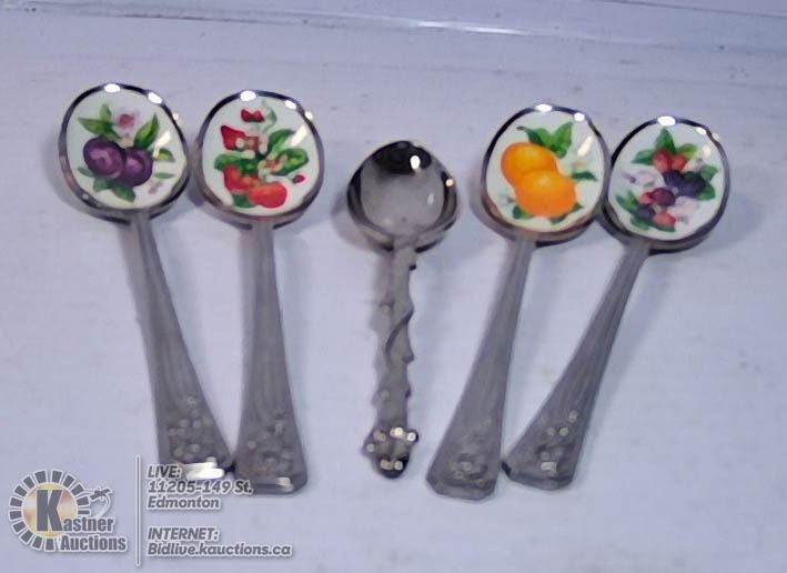 LOT OF 5 DECORATIVE SPOONS WITH FRUIT INLAY