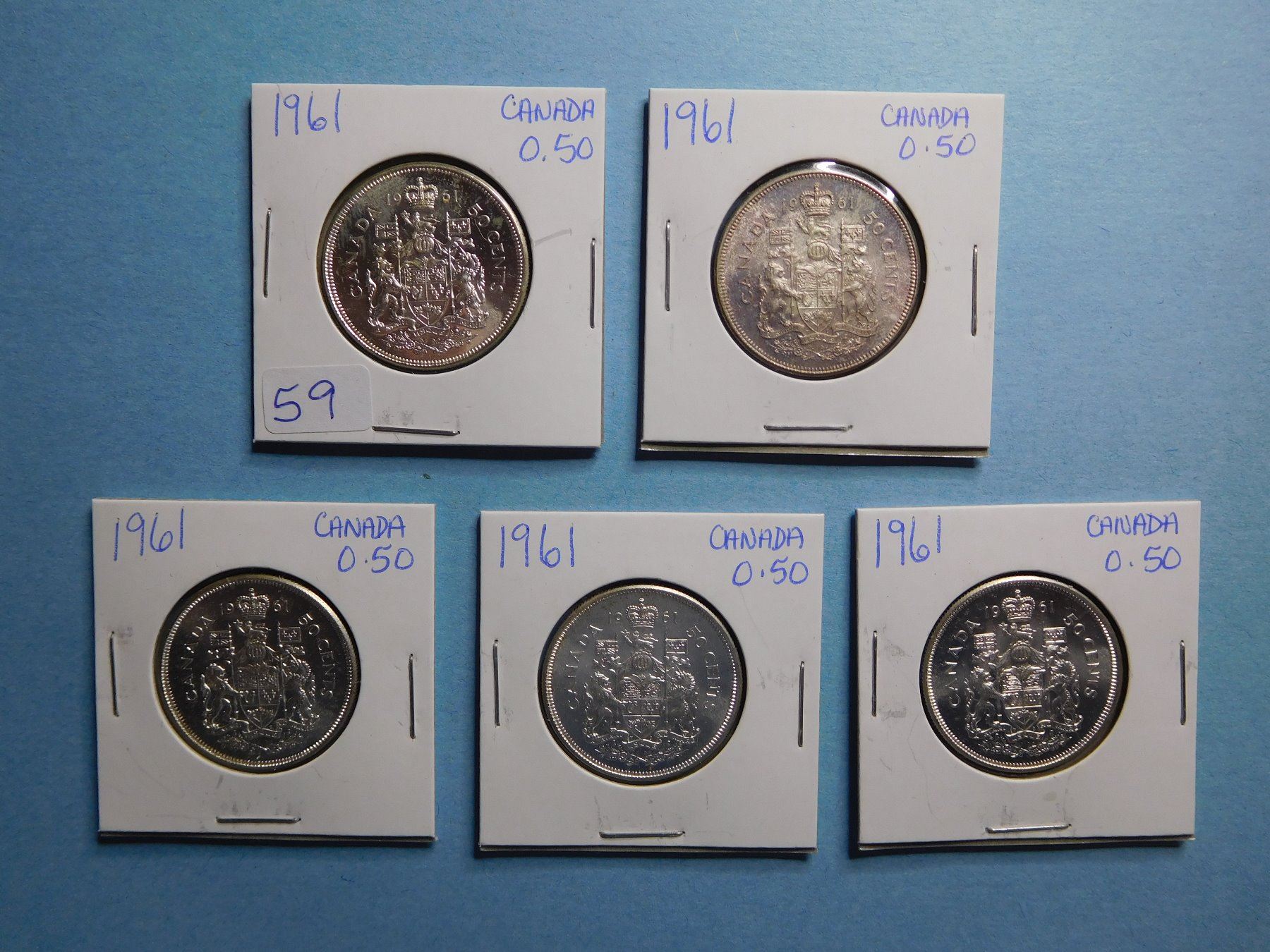 LOT OF 5 FIFTY CENT PIECES 1961