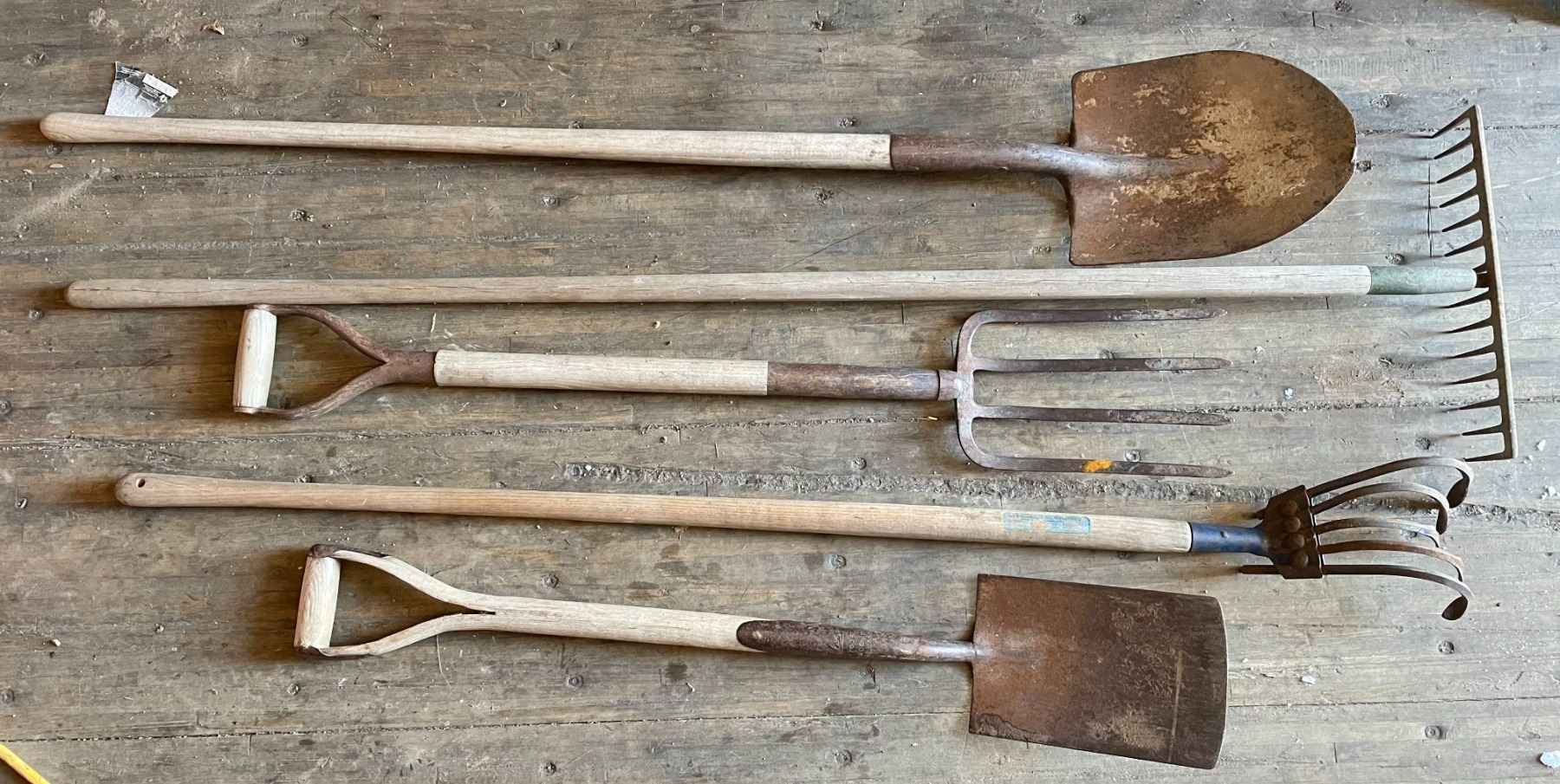 LOT OF 5 GARDEN TOOLS - 2 X SHOVEL, FORK, RAKE & CULTIVATOR
