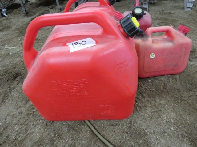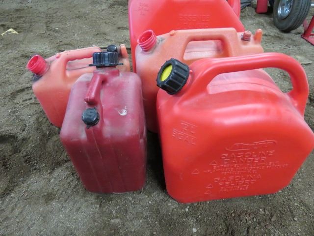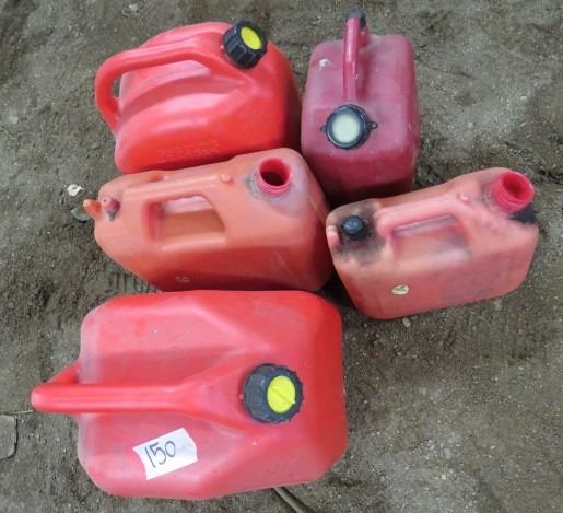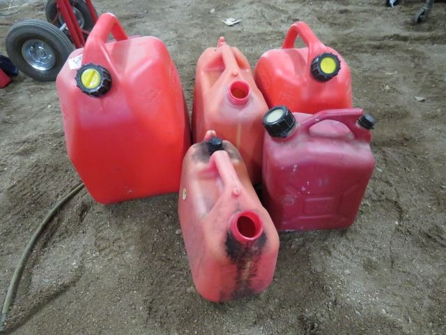 LOT OF 5 GAS CANS (3 WITH LIDS, 2 WITHOUT) *1, 3 & 5 GALLON*