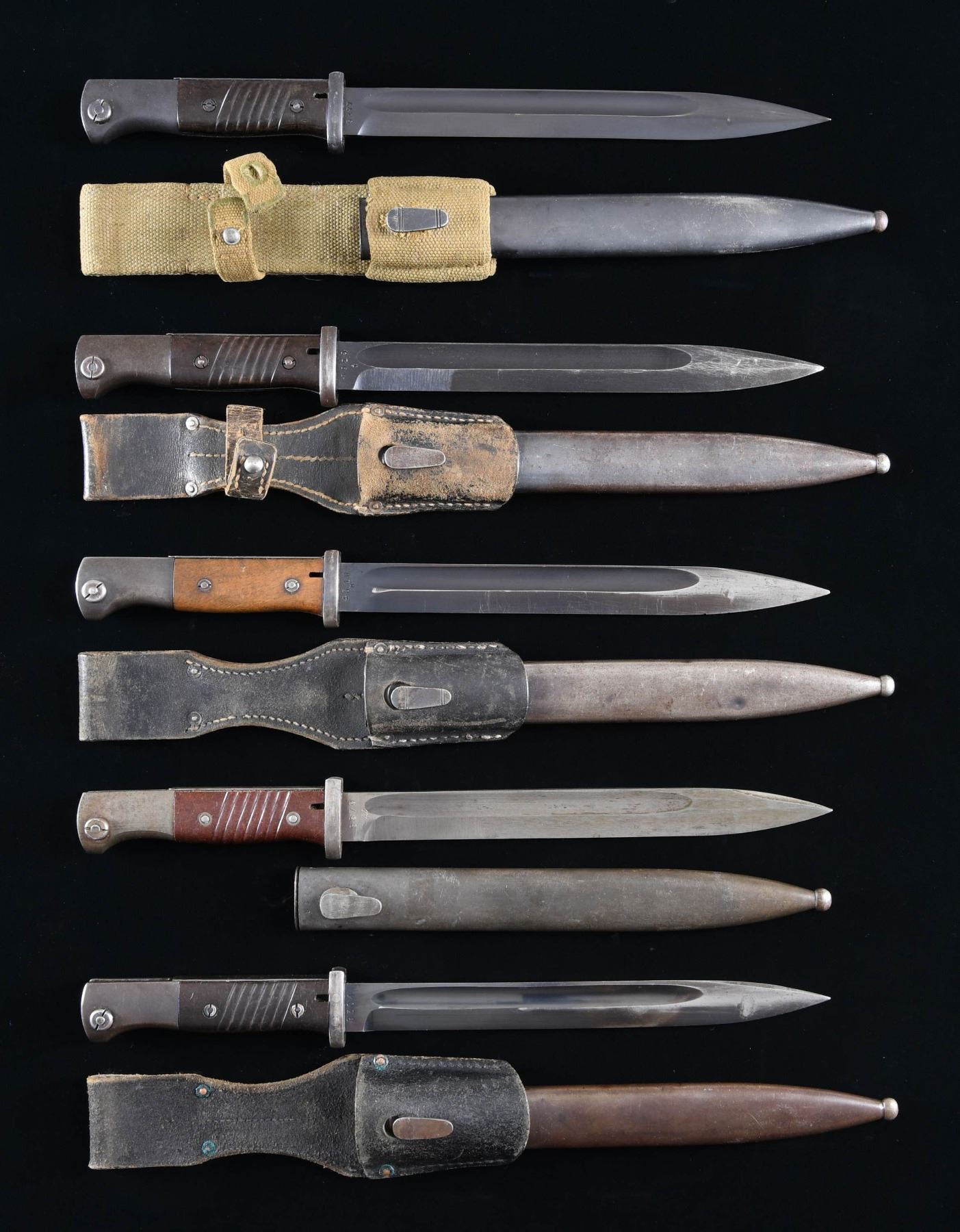 SCABBARDS. Lot of 5 German K98k bayonets with scabbards, including: 1) K98k bayonet mfg. by Carl Eickhorn in 1942. Left side of the ricasso is marked with the 2-digit year of mfg. and Carl Eickhorn's mfg. code "42 cof", with the S# "9920/ i" marked on the right. Left side of the pommel is marked with 2 Eagle/WaA519 proofs. Blade, guard, and pommel exhibit a blue finish overall. 2-piece grooved brown pressed resin grip scales. Complete with matching blued steel scabbard and unmarked brown leather frog. CONDITION: very good, with metal components retaining the majority of their original arsenal blue finish, exhibiting some areas of wear and thinning that show through to gray patina, as well as some scattered spots of surface oxidation. Grips show some superficial marks from handling and storage, but are otherwise very good overall. Scabbard retains good amounts of its original blue, exhibiting areas of wear and thinning overall that show through to gray patina as well as areas of light to mild surface oxidation. Frog remains malleable, exhibiting some age related cracking, with crazing present overall. 2) K98k bayonet mfg. by Ernst Pack & Sohne in 1942. Left side of the ricasso is marked with the 2-digit year of mfg., followed by Ernst Pack & Sohne's mfg. code "42 cul", with the S# marked on the right. Left side of pommel is marked with eagle acceptance proofs. Blade, guard, and pommel exhibit a blue finish overall. 2-piece grooved brown pressed resin grips. Complete with a matching blued steel scabbard and black leather frog. CONDITION: blade retains most of its original arsenal blue finish, exhibiting areas of wear and pitting at and around the tip. Guard and pommel exhibit areas of wear and thinning that shows through to gray patina, with light surface oxidation overall. Grips show scattered superficial marks and nicks from handling and storage, but otherwise remain sturdy and serviceable. Scabbard shows wear and thinning overall, with scattered nicks and dings. Frog remains malleable, showing age related cracking and crazing overall. 3) K98k bayonet mfg. by E.u.F. Horster in 1944. Left side of the ricasso is marked with the 2-digit year of mfg. followed by E.u.F. Horster's mfg. code "44asw", with the S# marked on the right. Left side of pommel is marked with an eagle acceptance proof. Blade, guard, and pommel exhibit a phosphate finish. 2-piece reddish brown grooved pressed resin grip scales. Complete with matching phosphate finished steel scabbard. CONDITION: very good, with metal components retaining the majority of their original arsenal phosphate finish, exhibiting some mild wear and thinning, with scattered spots of oxidation and age related discoloration present on the pommel. Grips show a few superficial marks from handling and storage, but otherwise are very good overall. Scabbard retains the majority of its original phosphate finish, exhibiting some light wear and thinning, scattered superficial handling marks, as well as some scattered spots of light surface oxidation. 4) K98k bayonet mfg. by F.W. Holler in 1939. Left side of the ricasso is marked "F.W.HOLLER", with the S# marked on the right, and "39" marked on the spine. Left side of the pommel is marked with 2 Eagle/WaA253 acceptance proofs. Blade, guard, and pommel exhibit a blue finish overall. 2-piece grooved brown pressed resin grip scales. Complete with a matching blued steel scabbard and canvas web frog. CONDITION: excellent, with metal components retaining the vast majority of their original blue finish, exhibiting some areas of light to mild wear and thinning. Pommel shows light to mild surface oxidation overall. Grips show some superficial marks from handling and storage, but otherwise remain very good overall. Scabbard shows some wear and thinning, scattered superficial handling marks, a few minor dents, as well as some scattered spots of light surface oxidation overall. Frog shows some age related discoloration, but otherwise remains sturdy and serviceable. 5) K98k bayonet mfg. by Josua Corts und Sohn in 1935. Left side of the ricasso is marked with Josua Corts & Sohn's mfg. code "S/184" followed by a "G", denoting mfg. in 1935, with the S# marked on the right. Left side of pommel is marked with 2 early style droop eagle acceptance proofs. Blade, guard, and pommel exhibit a blue finish. 2-piece smooth wood grip scales. Complete with matching blued steel scabbard and brown leather frog. CONDITION: good, with the blade retaining the majority of its original blue finish, exhibiting wear, thinning, and scattered spots of oxidation towards the tip, with a small chip to the blade edge approx. 2 1/2" from the tip. Guard and pommel exhibit wear and thinning that shows through to gray patina, with scattered spots of surface oxidation overall. Wood grips show some superficial marks and impressions form handling and storage, but otherwise remain sturdy and serviceable. Scabbard shows wear and thinning through to a gray patina, with scattered superficial handling marks, some pitting, as well as a few dents present overall. Frog remains malleable, exhibiting age related cracking and crazing. A nice assortment of German K98k bayonets, with their matching scabbards. (02-23947-2/MLW). $600-1,200.