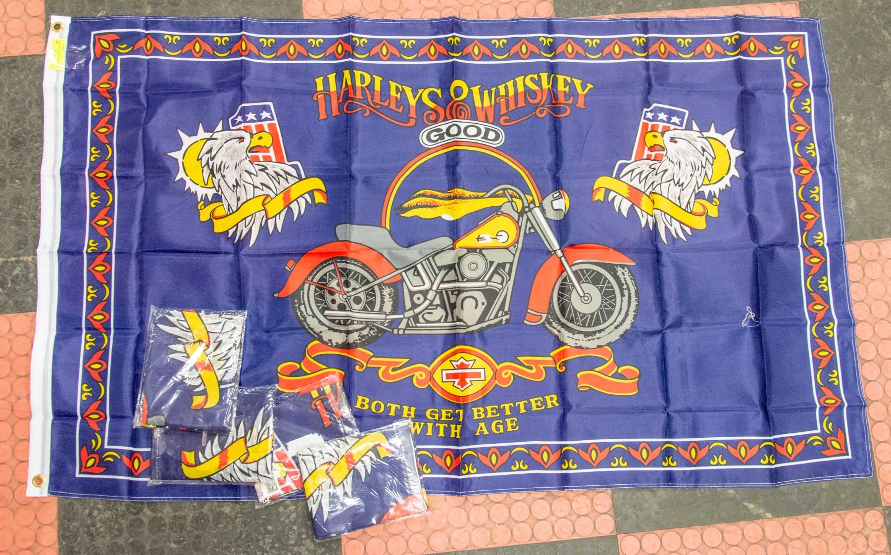 LOT OF 5 HARLEY & WHISKEY FLAGS, 3 FT BY 5 FT