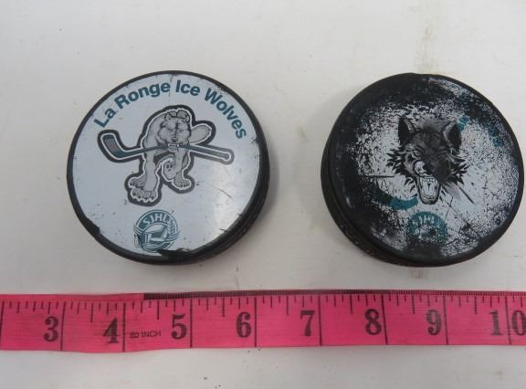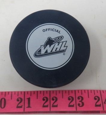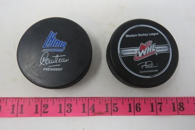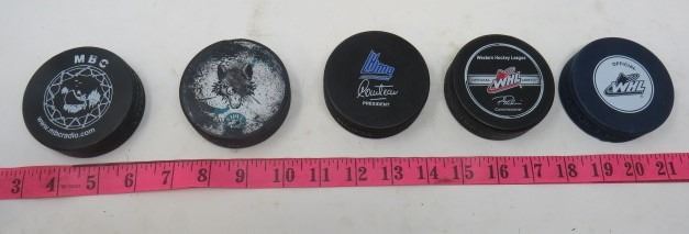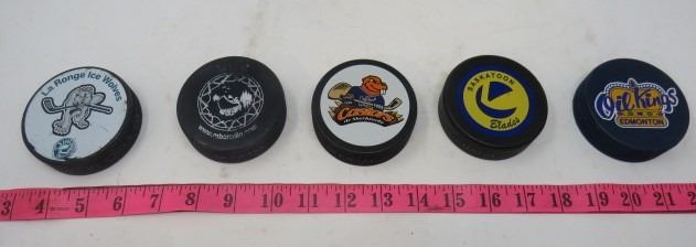 LOT OF 5 HOCKEY PUCKS (WHL SASKATOON BLADES, WHL OIL KINGS, ETC)