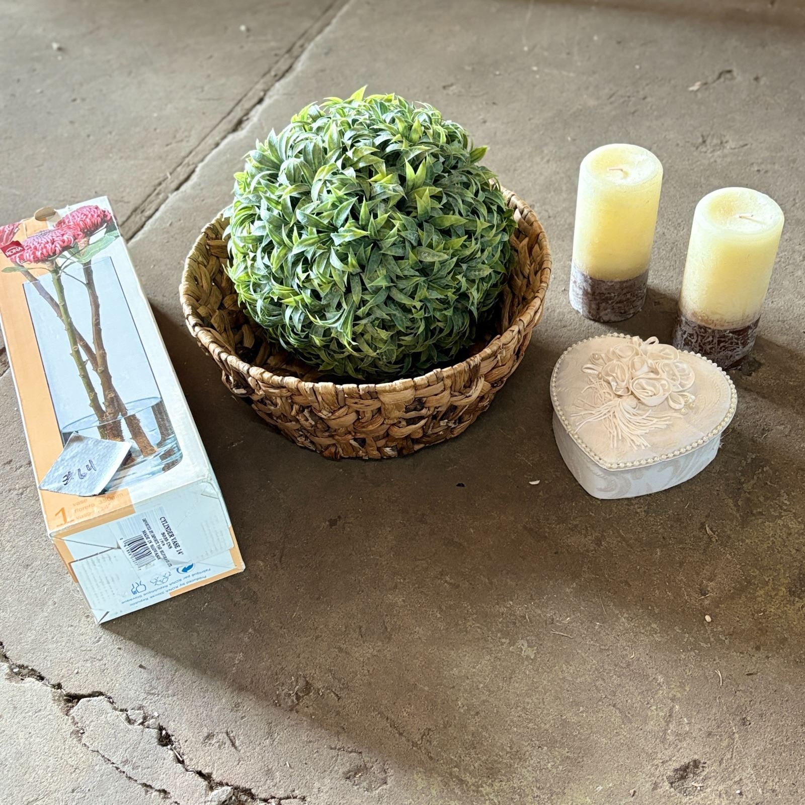 Trinket box, candles, basket with plastic plant ball and glass vase new in box
