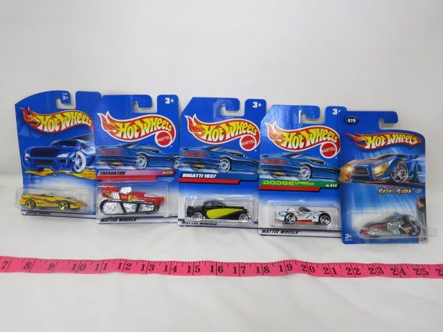 LOT OF 5 HOTWHEEL TOYS (37 BUGATTI, TREADATOR, 95 CAMARO, ETC…)