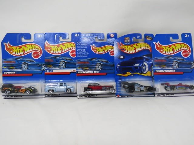 LOT OF 5 HOTWHEEL VEHICLES (X-PLODER, FORD 1956, ROLL PATROL 2/10, THUNDERSTREAK, DUESENBERG 1931)