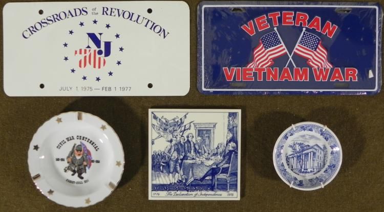 LOT OF 5 ITEMS CIVIL WAR-DEC OF INDEPENDENCE -VIET NAM2 LICPLATES-VET VIET NAM-NJ 1776/1975--DEC OF IND CERAMIC--CONFEDERATE WHITE"HOUSE PLATE (4 1/4"")--CIVIL WAR CENTENNIAL PLATR"