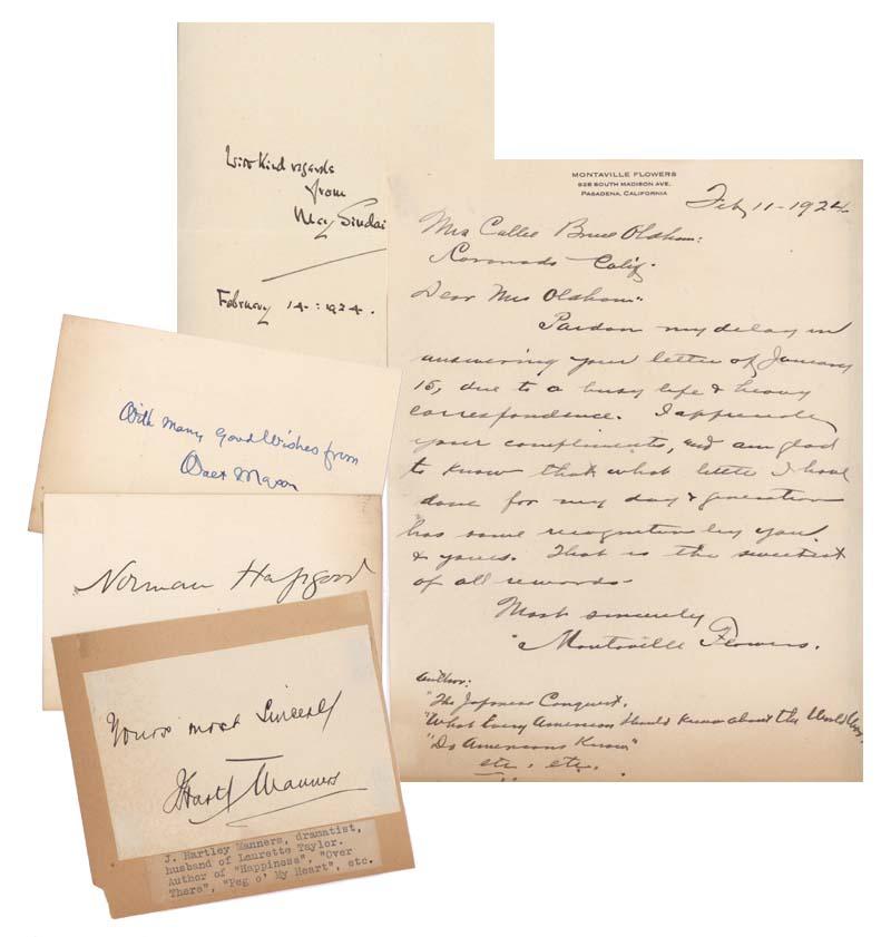 Norman Hapgood (1868-1937), Walt Mason (1862 - 1939), J. Hartley Manners (1870 – 1928), May Sinclair (1863 – 1946, Montaville Flowers. Mounting traces on verso. All generally fine or better.