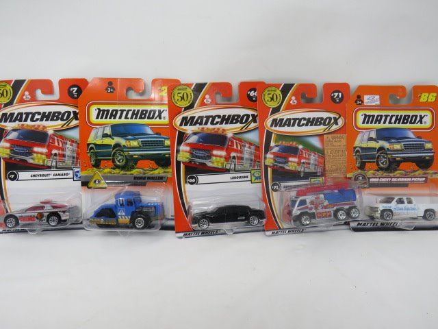 LOT OF 5 MATCHBOX VEHICLES (CHEVROLET CAMARO, ROAD ROLLER, LIMOUSINE, AERO FLOODER, 1999 CHEVY SILVERADO PICKUP)