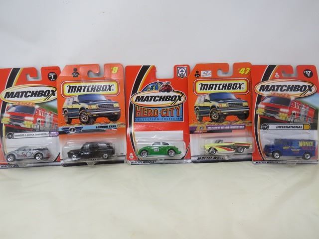 LOT OF 5 MATCHBOX VEHICLES (LONDON TAXI, INTERNATIONAL VOLKSWAGON TAXI, 1957 CHEVY BELAIR CONVERTIBL
