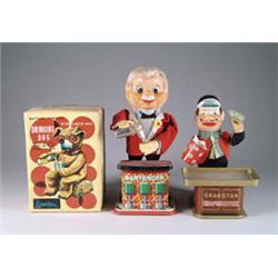 LOT OF 5 MECH. TOYS. 1) Santa Bank in O.B., 1960 Japan. 2) Cocktail shaking bartender. 3) Cragstan Crapshooter. 4) Drinking Dog in O.B. by Cragstan. 5) Roulette Man in O.B. SIZE: Varies. CONDITION: #1 working and very good; #2, 3, 4 not working, otherwise good; #5 good to very good and working. 1-1953 WP