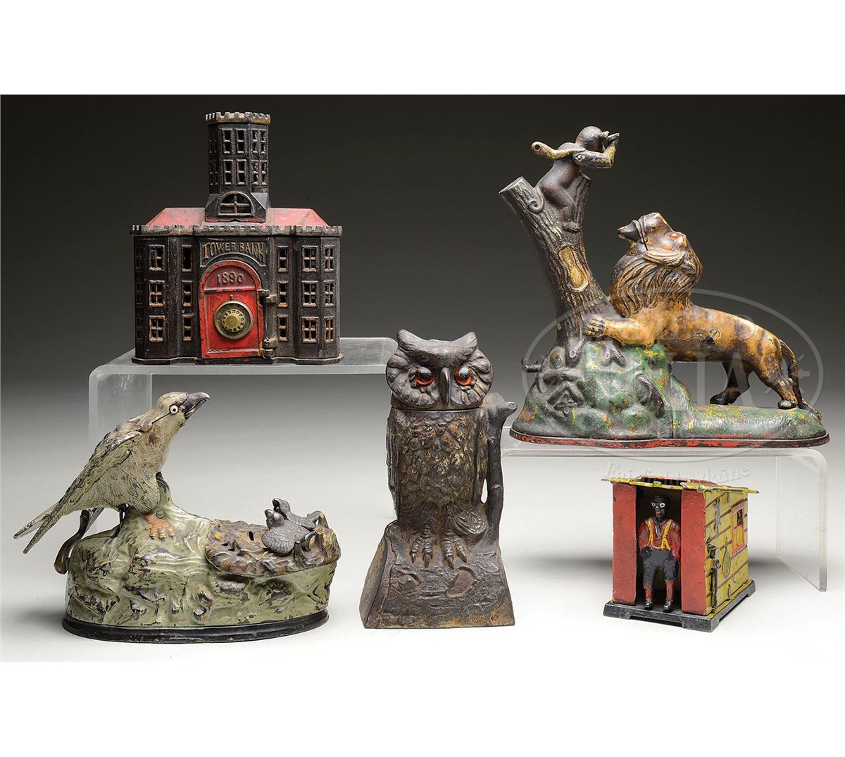 Lot includes 1) Eagle & Eaglets. A visually attractive bank of the mother eagle feeding her two eaglets. Bellows intact and somewhat audible. However, eagle's wing is either disconnected or has internal damage. Overall paint is good to very good and retains original trap. 2) Darky in Cabin. Void of typical cracks, chips, or damage. Overall very strong paint. Still retains trap. 3) Owl Turns Head. Complete and in working order, yet in poor to fair condition. 4) Lion & Monkeys that would benefit greatly from a good cleaning. Large monkey retains right arm. However, missing left arm and small monkey behind. Lacking original trap. Paint is good. 5) Tower still bank. A japanned building bank with red roof, doors and dial combination on front door. Overall finish is good to very good. Hairline crack emanating from screw on underside of base. SIZE: Varies from 4" l x 9" l. CONDITION: As stated above. 1-12821
