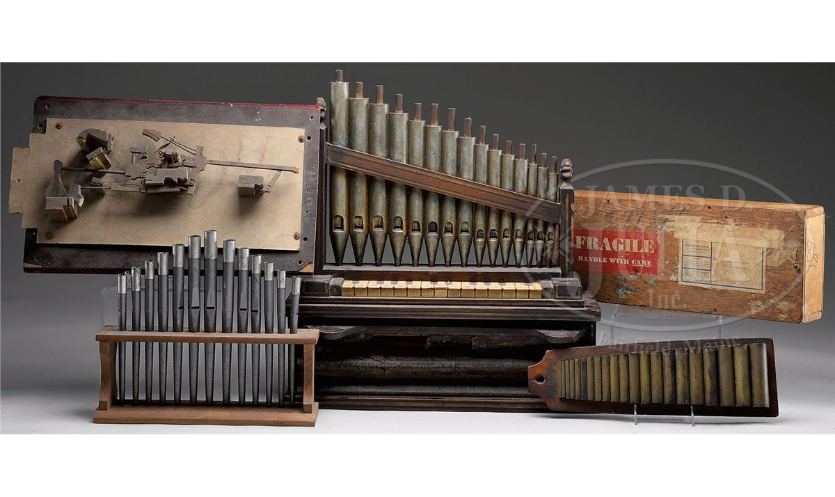 Lot includes 1) Miniature pump organ with leather bellows. 2) Two piano percussion mechanisms. 3)Set of graduated pump organ tubes in wooden display rack. 4) Set of 21 graduated brass tubes mounted to a wooden plaque. SIZE: Largest 21" l x 22-1/2" h x 8" d. CONDITION: Leather bellows has deteriorated. One of the percussion mechanisms shows some damage. Otherwise lot is good to very good. 1-13593