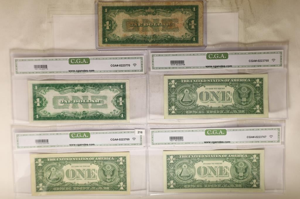 US NOTE RED SEAL, 1928-A $1 FUNNY BACK SILVER CERTIFICATE CGA VERY FINE 35, 2-1957 US $1 SILVER CERTIFICATES BLUE SEALS CGA EXTRA FINE & ABOUT UNC AND 1957-B US $1 SILVER CERTIFICATE BLUE SEAL CGA EXTRA FINE 40