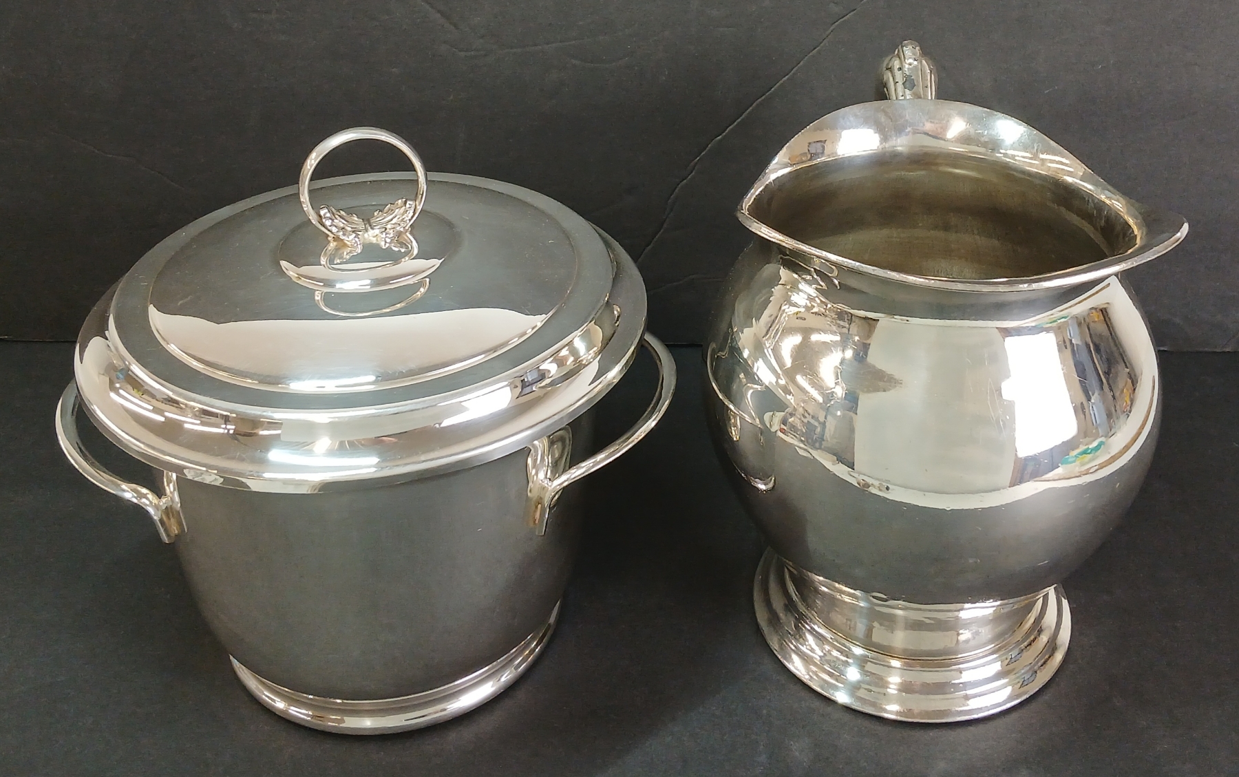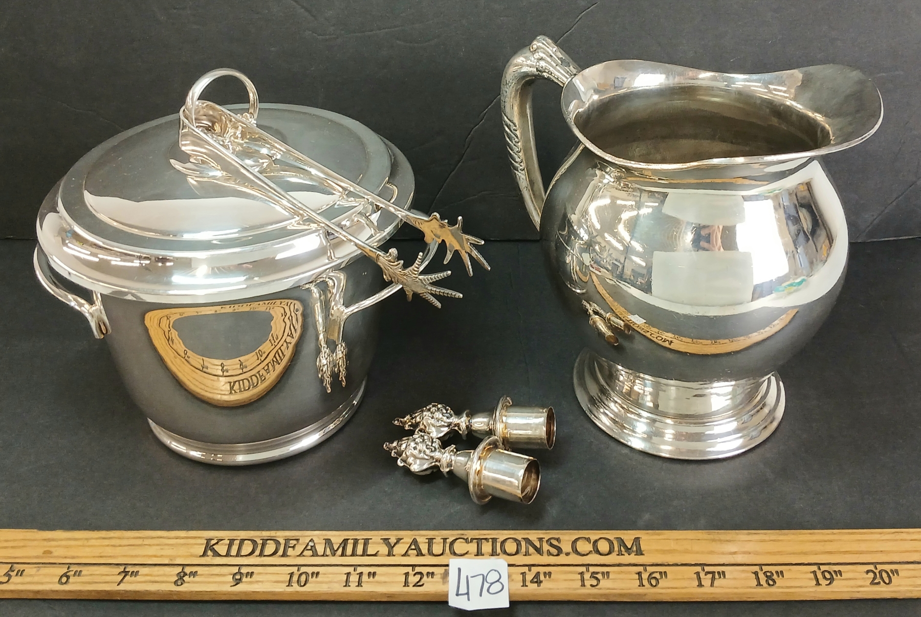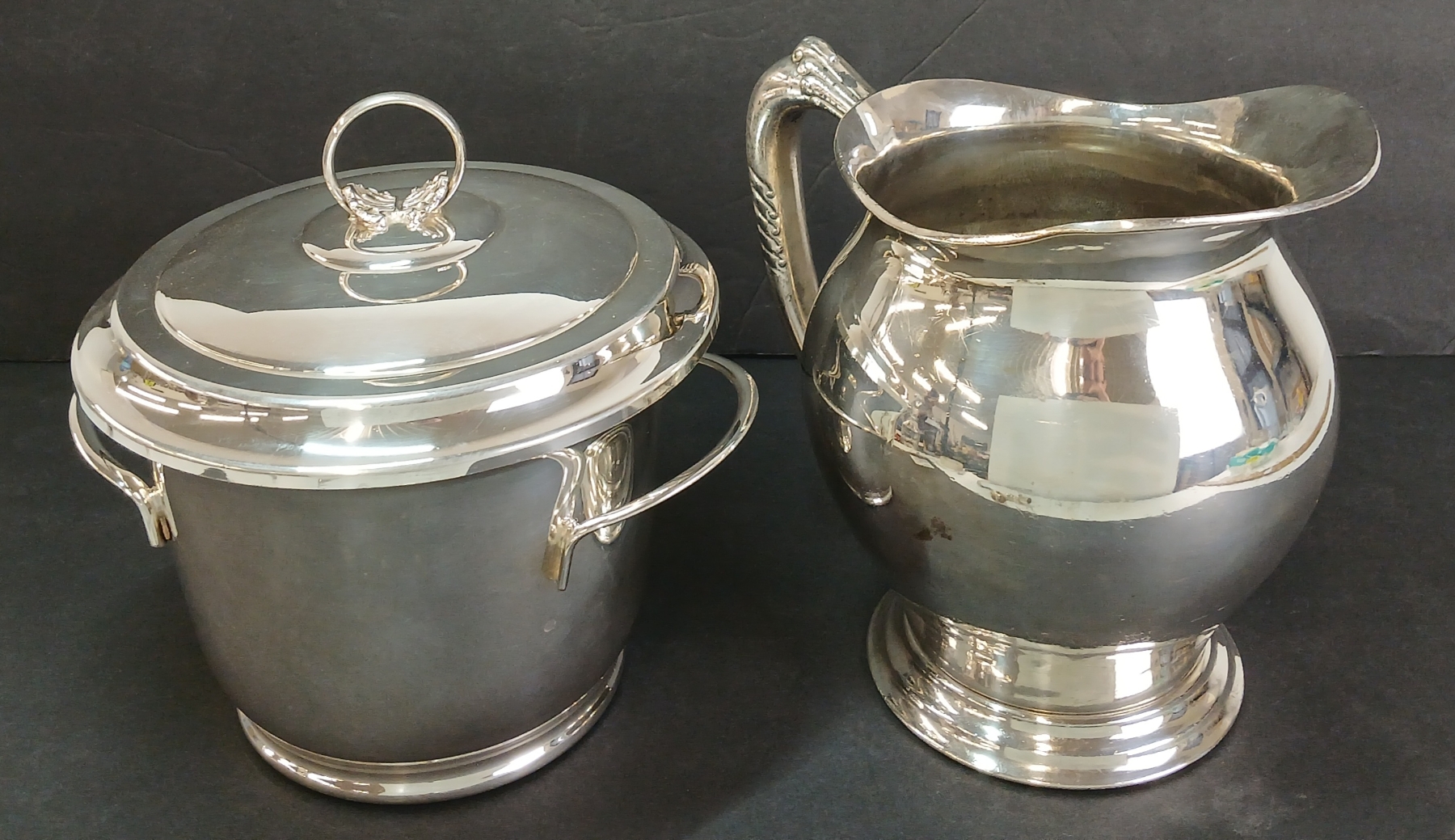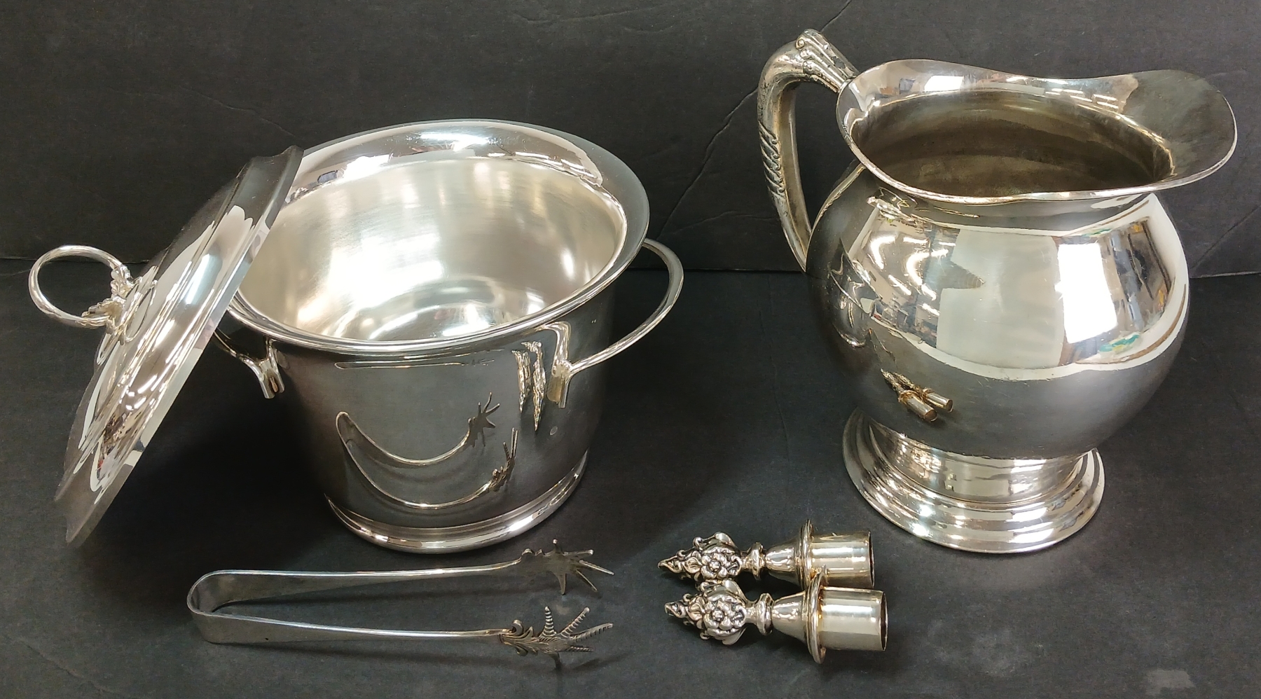 NOTE: PITCHER, BUCKET & TONGS SILVERPLATED (4LBS) - BOTTLE STOPPERS NOT MARKED