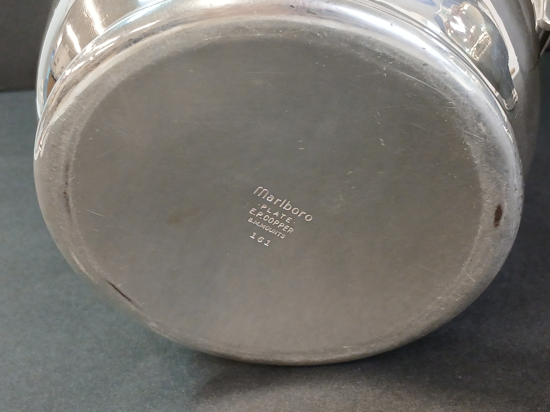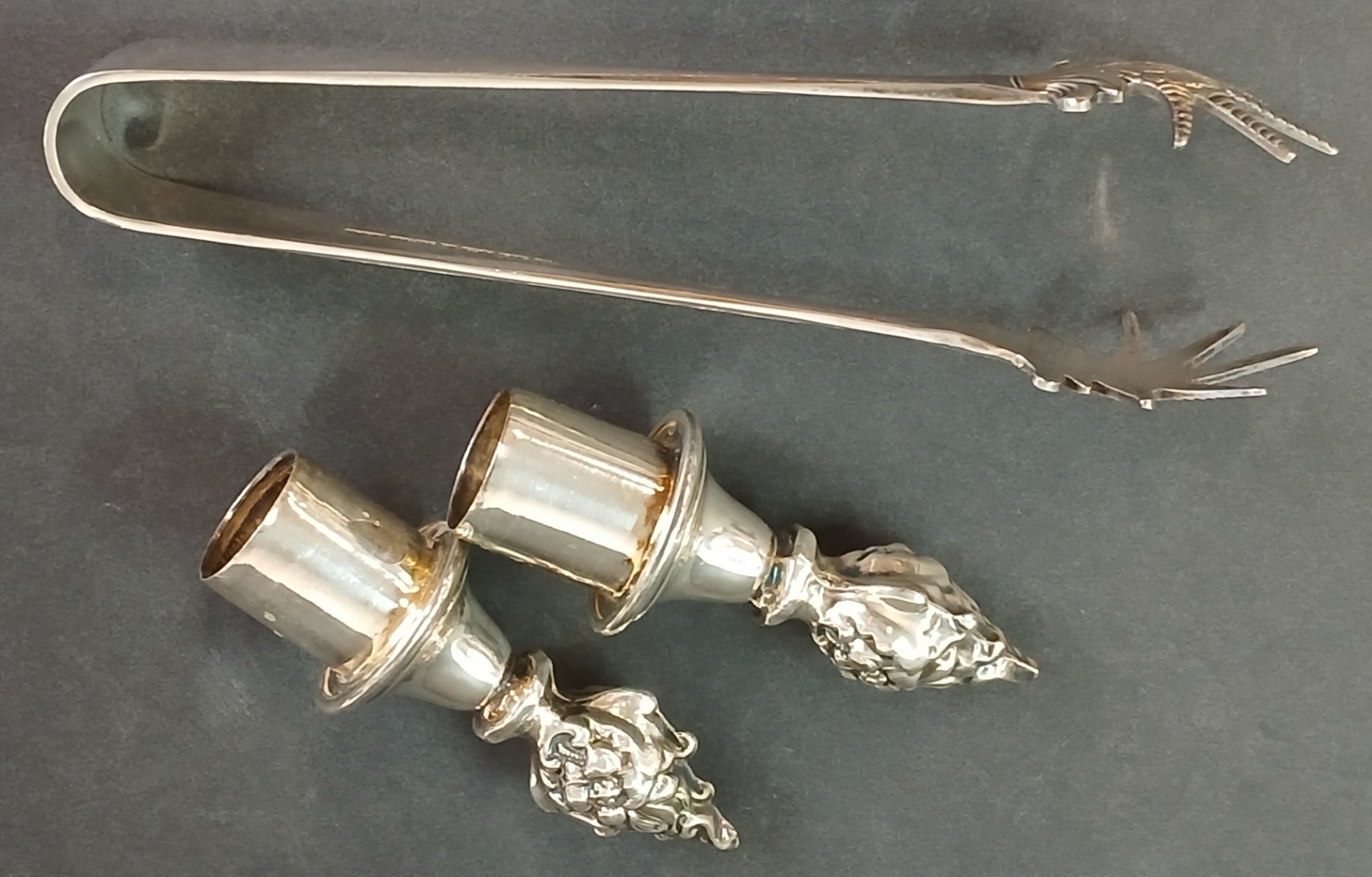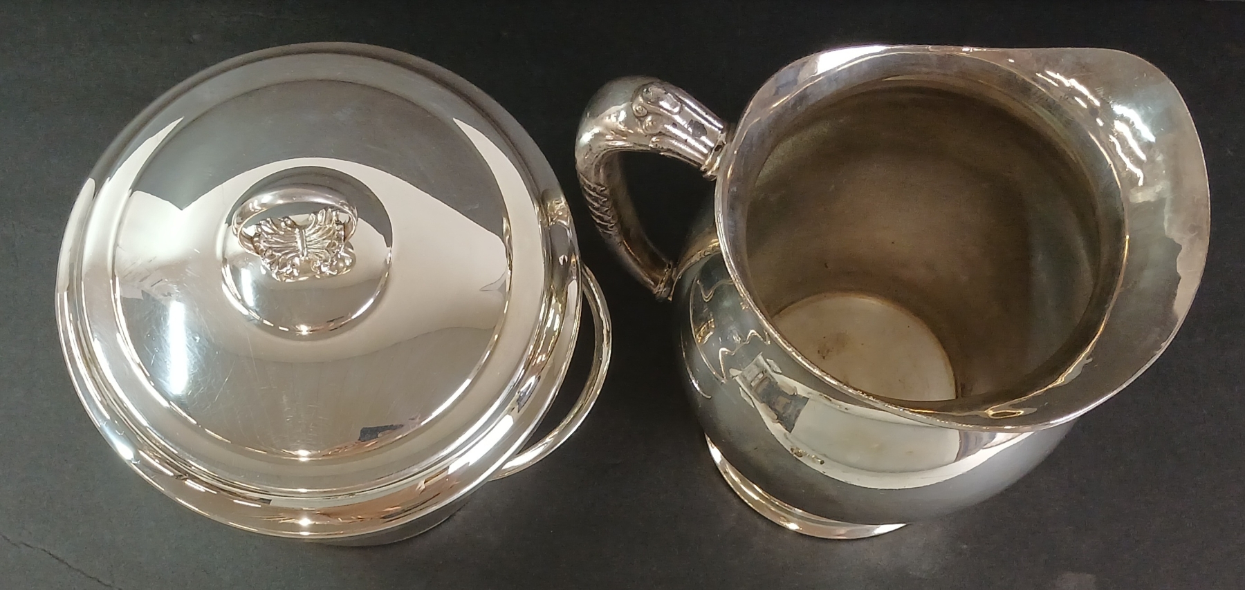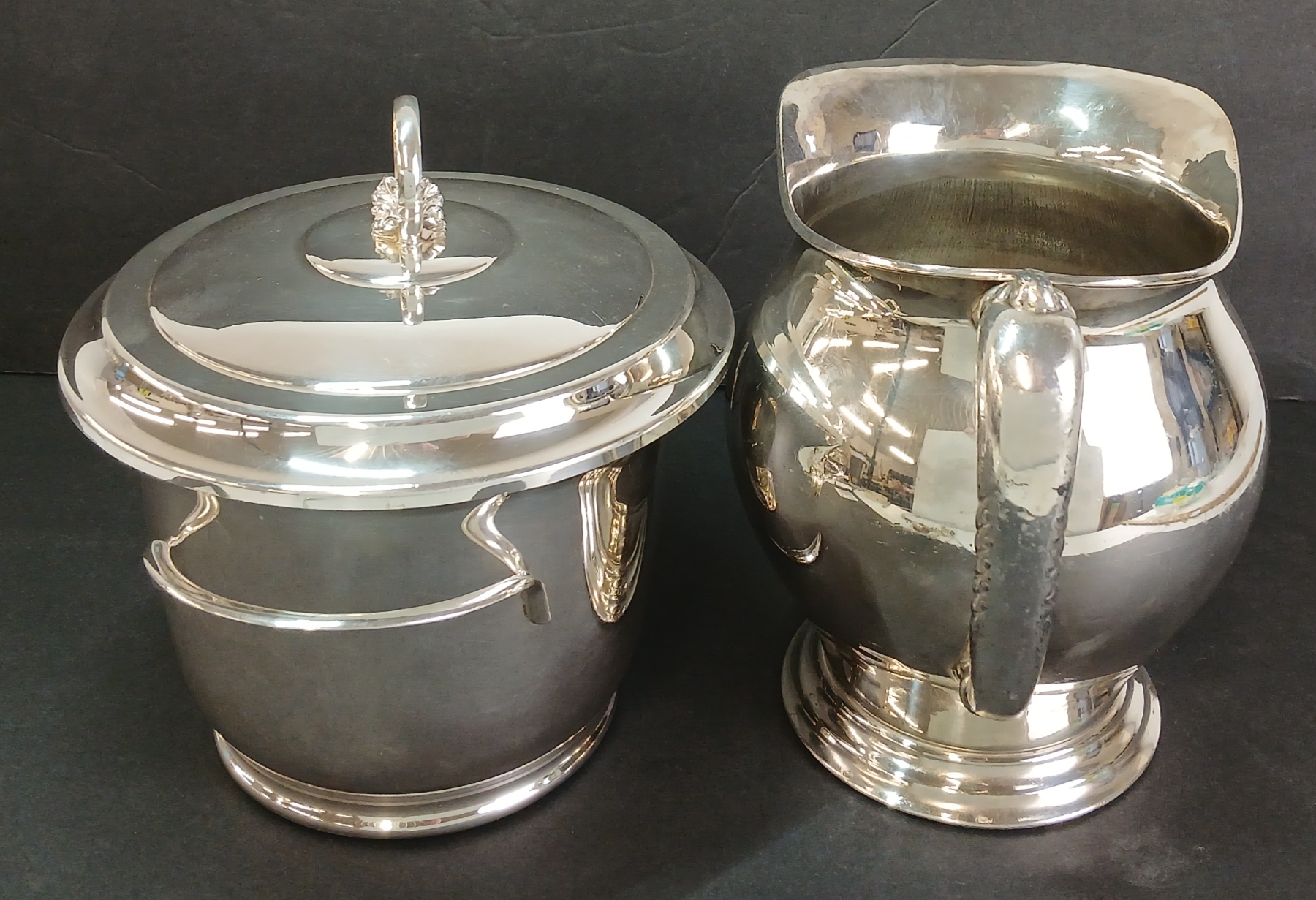 NOTE: PITCHER, BUCKET & TONGS SILVERPLATED (4LBS) - BOTTLE STOPPERS NOT MARKED
