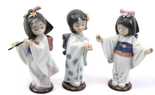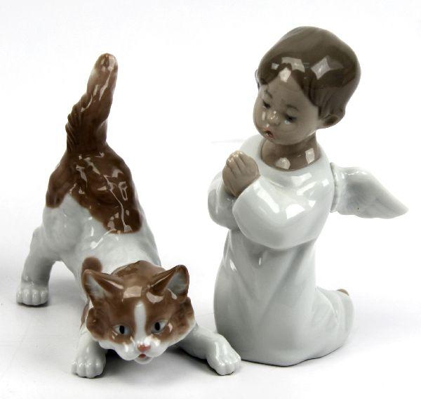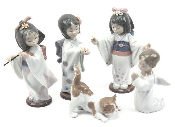 Collection includes: a 7.5 inch retired "Bearing Flowers" #6151, a 7.75 inch retired "Flower Gazer" #6152, a 7.75 inch retired "Playing the Flute" #6150, a 4.25 inch retired "Playful Cat" #5091, and a 5 inch "Angel Praying" #4538. All are in excellent con