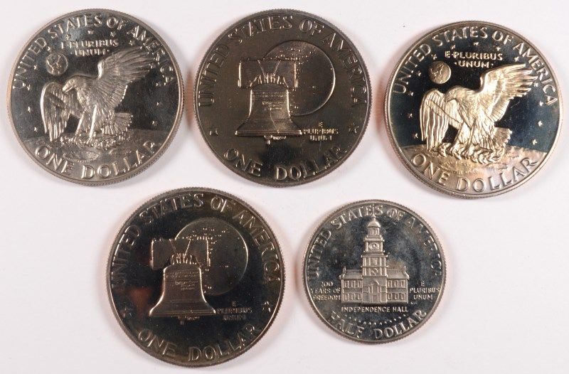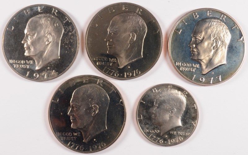 LOT OF ( 5 ) PROOF COINS: ( 4 ) EISENHOWER DOLLARS, BU & ( 1 ) 1976 KENNEDY HALF