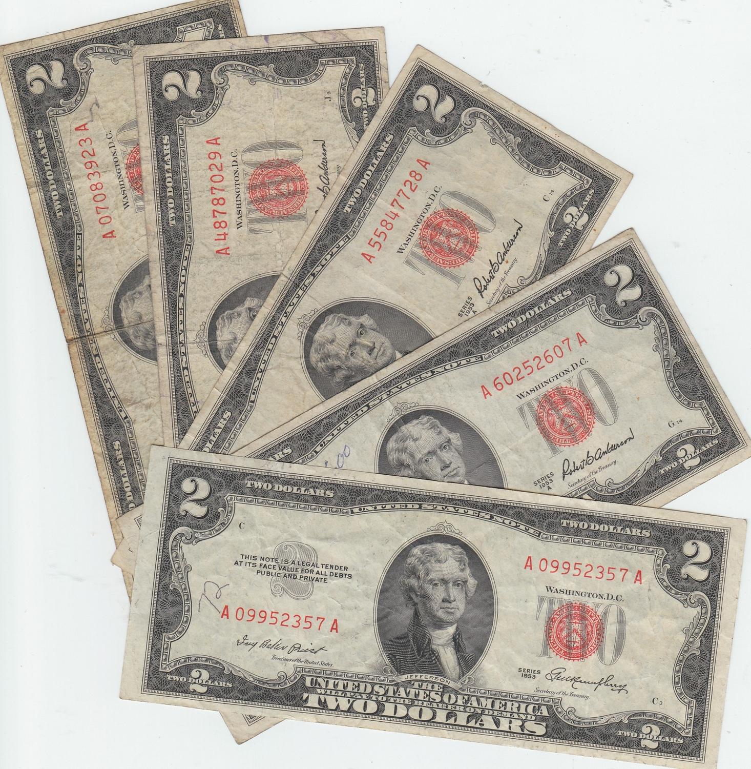 LOT OF 5 RED SEAL $2 LEGAL TENDERS 1953