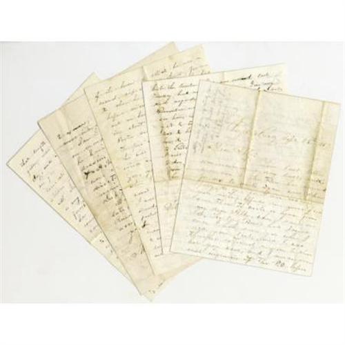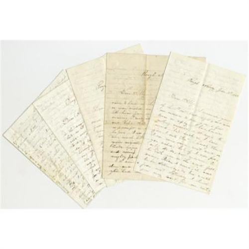<B>LOT OF (5) ROUGH & READY (CALIFORNIA) GOLD RUSH LETTERS 1859</B></I> - Rough & Ready, California 1859. The 1850's were good years for the town, during which time it was the center of activity in the region. But as the gold slowly gave out in the creeks and on the flats, and after the fires of 1856 and 1859 nearly obliterated the town, leaving only twenty-four houses, the town declined almost as quickly as it had developed. This lot consists of (5) Gold Rush era letters, From May 1859-Sept. 1859. <I>“affair occurred at Mooney Flats, (a place a short distance beyond Rough & Ready) day before yesterday, between old Mr. Cague?, and other parties the names of whom I did not known resulting, from a pistol shot by Mr. Cague?”</B></I> All letters signed by James.<BR><BR><B>Condtion:</B></I>Very fine.<BR><BR><b>Shipping:</b> Flat Material, Small (<a target="_blank" href="http://www.heritageauctions.com/common/shipping.php">view shipping information</a>)