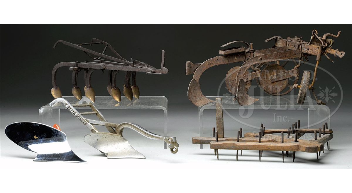 Lot includes a nickel plated John Deere walk behind plow, Allis-Chalmers nickel plated and painted plow blade, an unmarked nine prong plow/tiller, and two primitive pieces of farm equipment. SIZE: Largest 12" l. CONDITION: First two plows are very good to near excellent, remainder of lot is fair to good. 1-13544