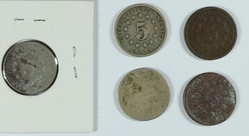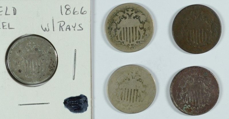 LOT OF ( 5 ) SHIELD NICKELS, 1866, 67, 69, 73, AND 74