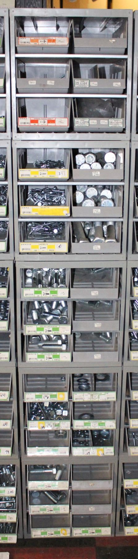 LOT OF 5 STACKABLE PARTBINS WITH ASSORTED HARDWARE