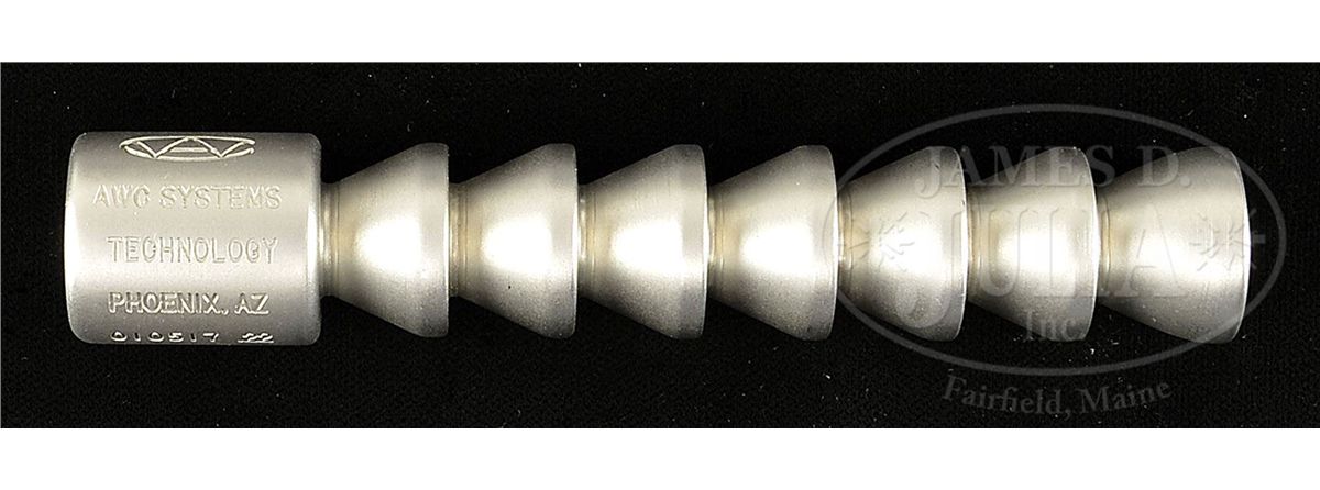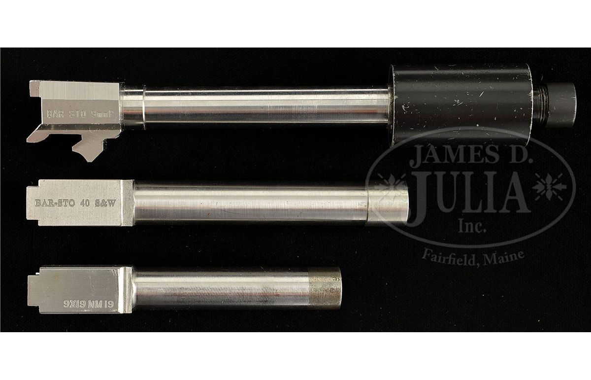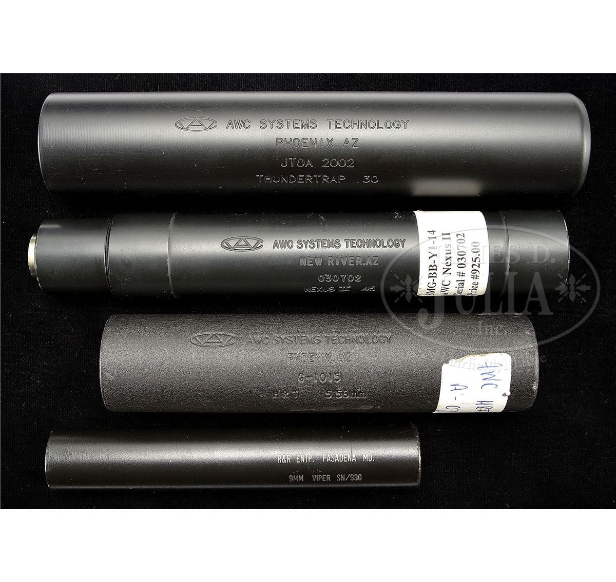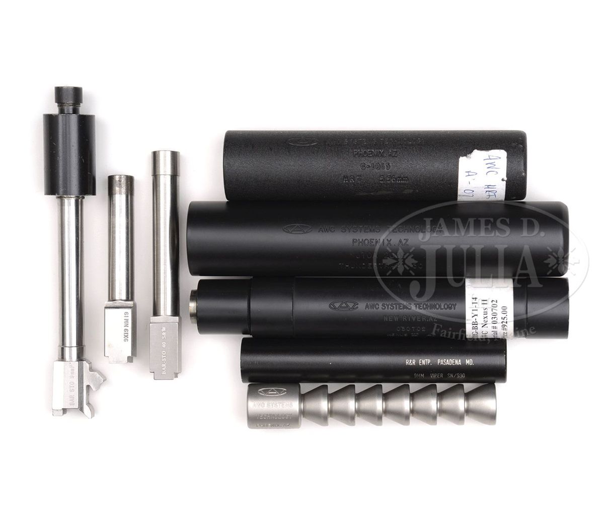 PLEASE NOTE (10-10-13): This lot required FIVE NFA transfers not FOUR NFA transfers as stated in the catalog. SN 010517, 61015, 030702, 930, JTOA2002. Included in this lot are 1) AWC Systems Thundertrap .30 suppressor in box with instruction manual. 2) AWC Systems Oddysey .22 stainless steel suppressor. 3) AWC Nexus II .45 suppressor. 4) AWC HRT 5.56mm suppressor with instruction manual. 5) R&R ENTP. Viper 9mm suppressor. 6) Three BAR-STO threaded pistol bbls two are 9mm, one is 40 S&W, along with one AWC 9mm extension/adapter. Lot requires four NFA transfers. PROVENANCE: The estate of a Private Collector. CONDITION: All of these parts and bbls are in excellent condition appearing new or as new with exception of the R&R ENTP Viper which has some brassing near thread attachment where it has been screwed on to adapter. This should be an attractive lot for an enthusiast of silencers. 4-49212 JWK47